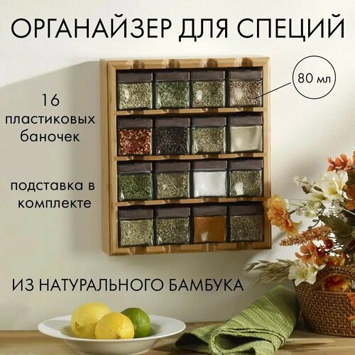 Комплектация: Подставка для специй бамбуковая 1 шт., баночки для специй 16 шт., крепление к стене 1 комплект.