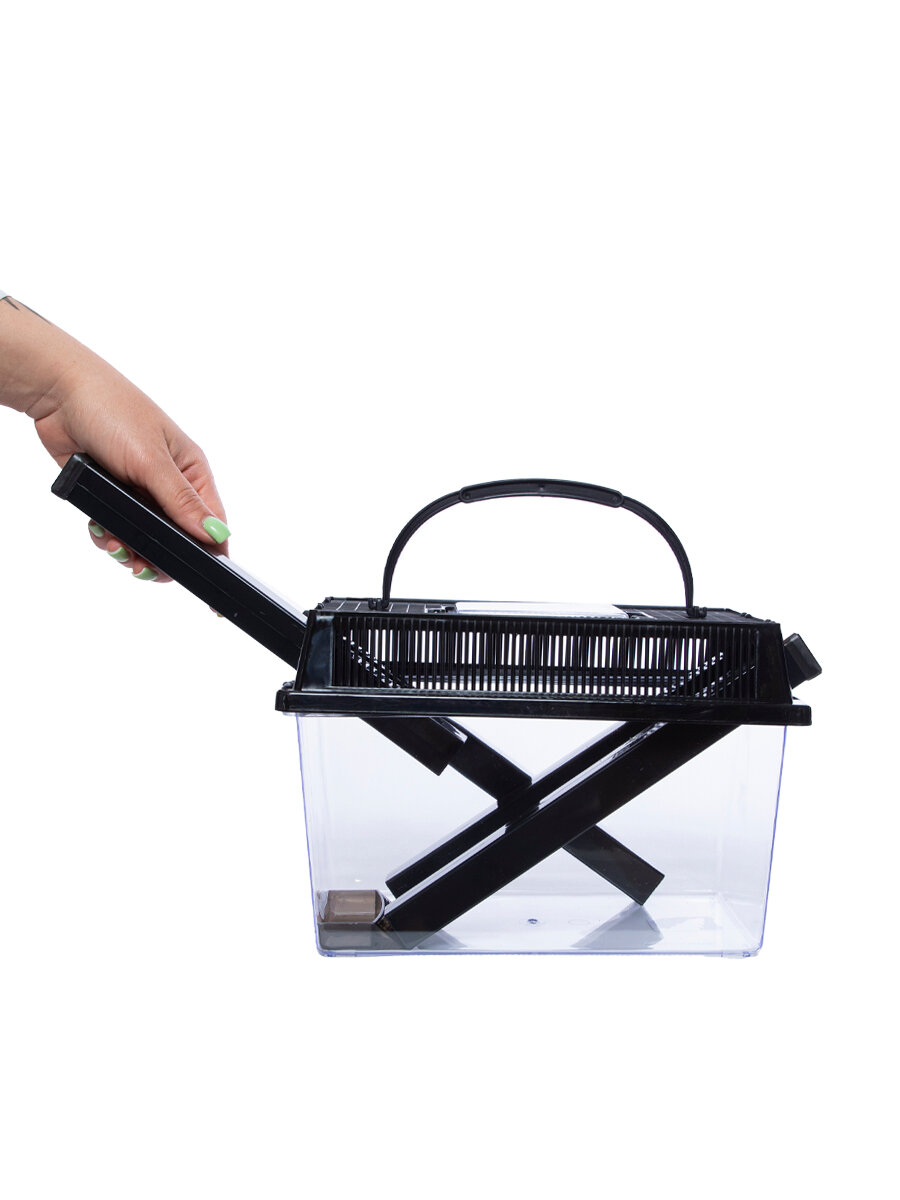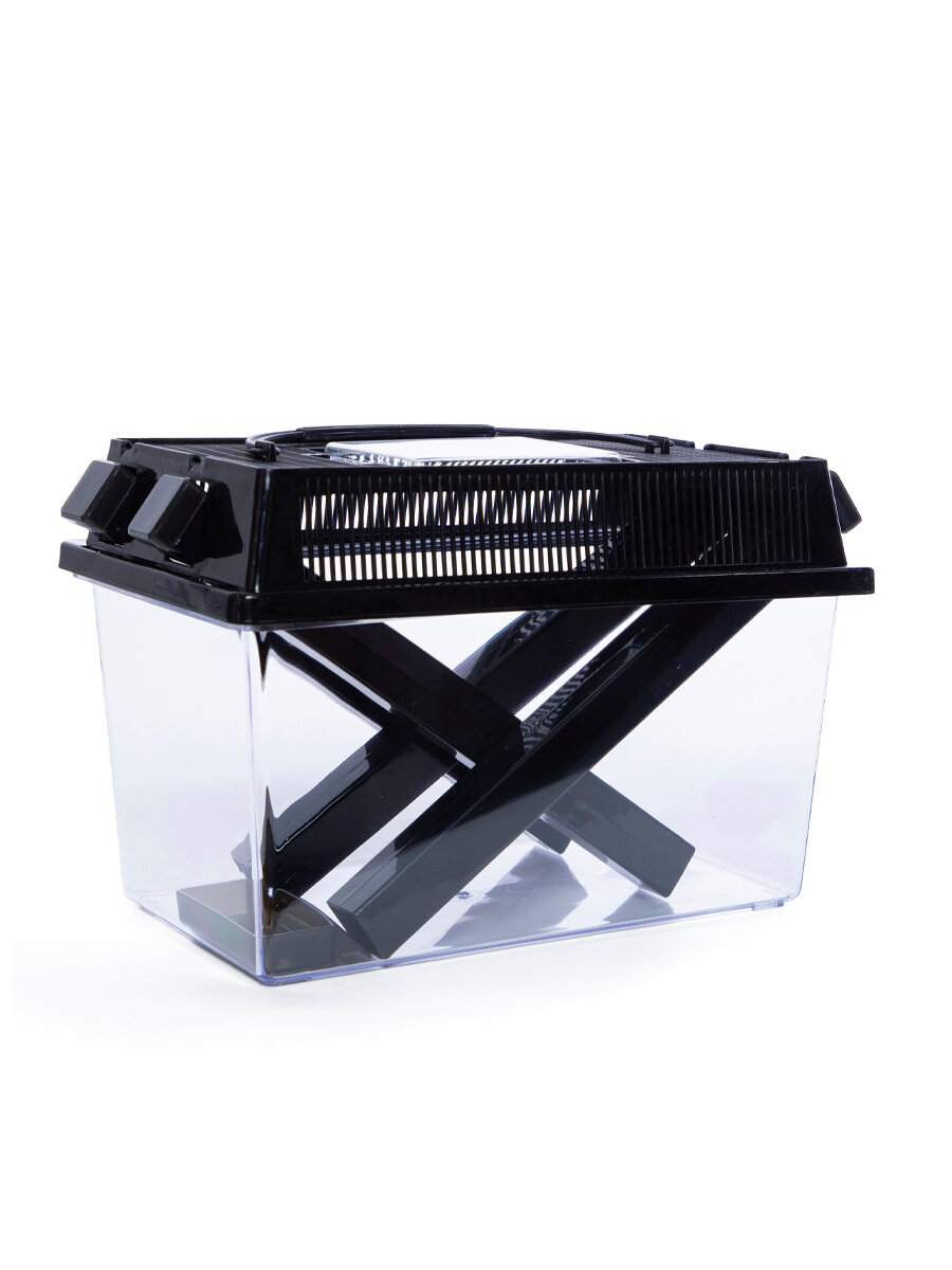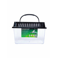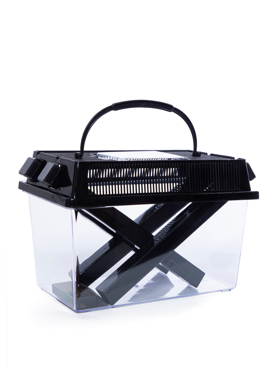 В комплекте идет сам контейнер, поилка и кормушка для насекомых, крышка с отверстиями для вентиляции и ручкой, трубки для выдачи корма.