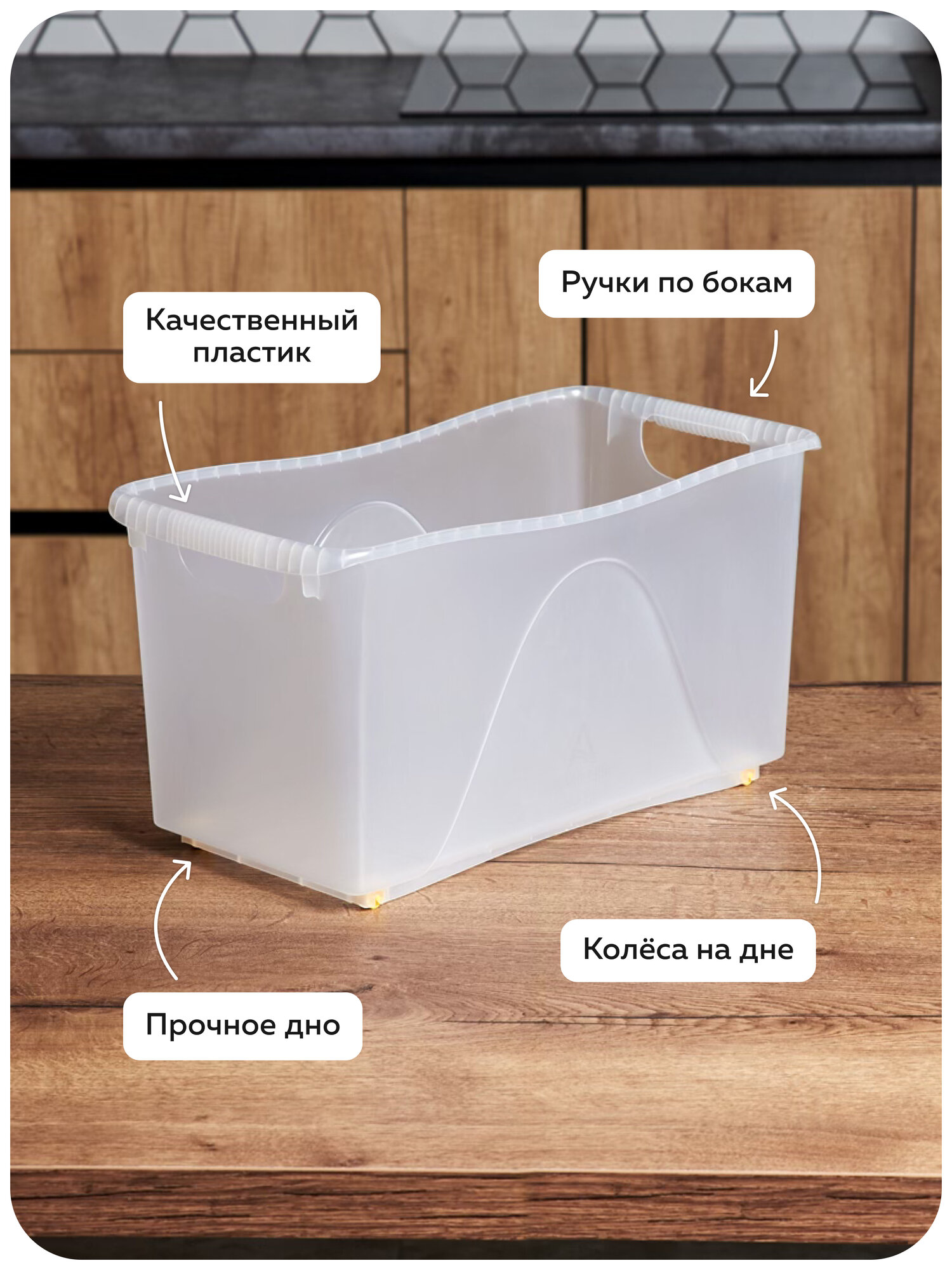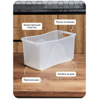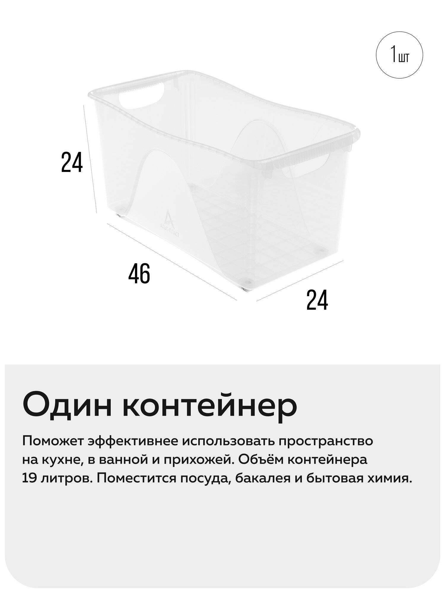 Пластиковый контейнер для хранения «Макс» прочный и надёжный. У него крепкий бортик и толстое дно с рёбрами жёсткости. Посуда и бутылки с маслом будут в безопасности: они не выпадут и не разобьются. Дно и стенки выдержат нагрузку — всё будет в порядке.
