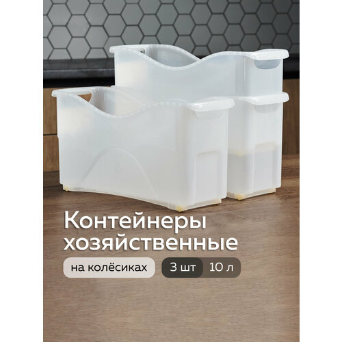 У контейнера для хранения пластикового есть две ручки по бокам и четыре колеса на дне. Заполненный контейнер легко перенести и выкатить с полки.
