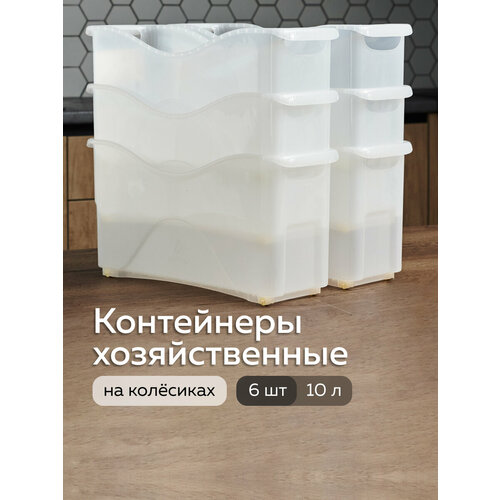 У контейнера для хранения пластикового есть две ручки по бокам и четыре колеса на дне. Заполненный контейнер легко перенести и выкатить с полки.