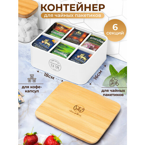 Контейнер для хранения чайных пакетиков от Elan Gallery – это идеальное решение для любителей чая. Стильная коробочка элегантного белого цвета выполнена из металла, имеет бамбуковую крышку. Размер 18,5х16х8 см. Имеет полностью съёмную крышечку и 6 одинаковых секций внутри. Размер каждой внутренней ячейки – 5,5х7,5х6,5 см. Высота контейнера без крышки 7 см. Металл в составе изделия обеспечивает его долговечность, а натуральный бамбук придаёт стиля и природной гармонии. Металлические стенки украшены лаконичной надписью "Tea time" ("Время чая"), а прямоугольная крышка – логотипом бренда. Благодаря стильному органайзеру с отсеками ингредиенты для заваривания любимого напитка будут всегда под рукой! Добавьте домашнему интерьеру стиля и комфорта. Крышечка защищает чайные пакеты от пыли и влаги. Ёмкость можно использовать для хранения капсул для кофемашины, пакетиков с растворимым кофе, фильтр-пакетов с травами. Удобно для пуэра в таблетках. Подойдёт в роли секционной банки для хранения разных видов чая. Храните сорта зелёного и чёрного чая в одной баночке и наслаждайтесь ежедневной дегустацией! Эта функциональная подставка станет предметом декора для интерьера вашей столовой. Шкатулка для чая – чудесный сюрприз на любой праздник для любителей чаепитий. Поставляется в красочной картонной коробке, поэтому не потребуется подарочная упаковка. Нельзя использовать абразивные моющие средства. Нельзя использовать в посудомоечной машине и микроволновой печи. Сделайте оригинальный подарок себе или близким – маленький ящик для чайных пакетиков украсит вашу кухню и поможет хранить всё необходимое в одном месте.