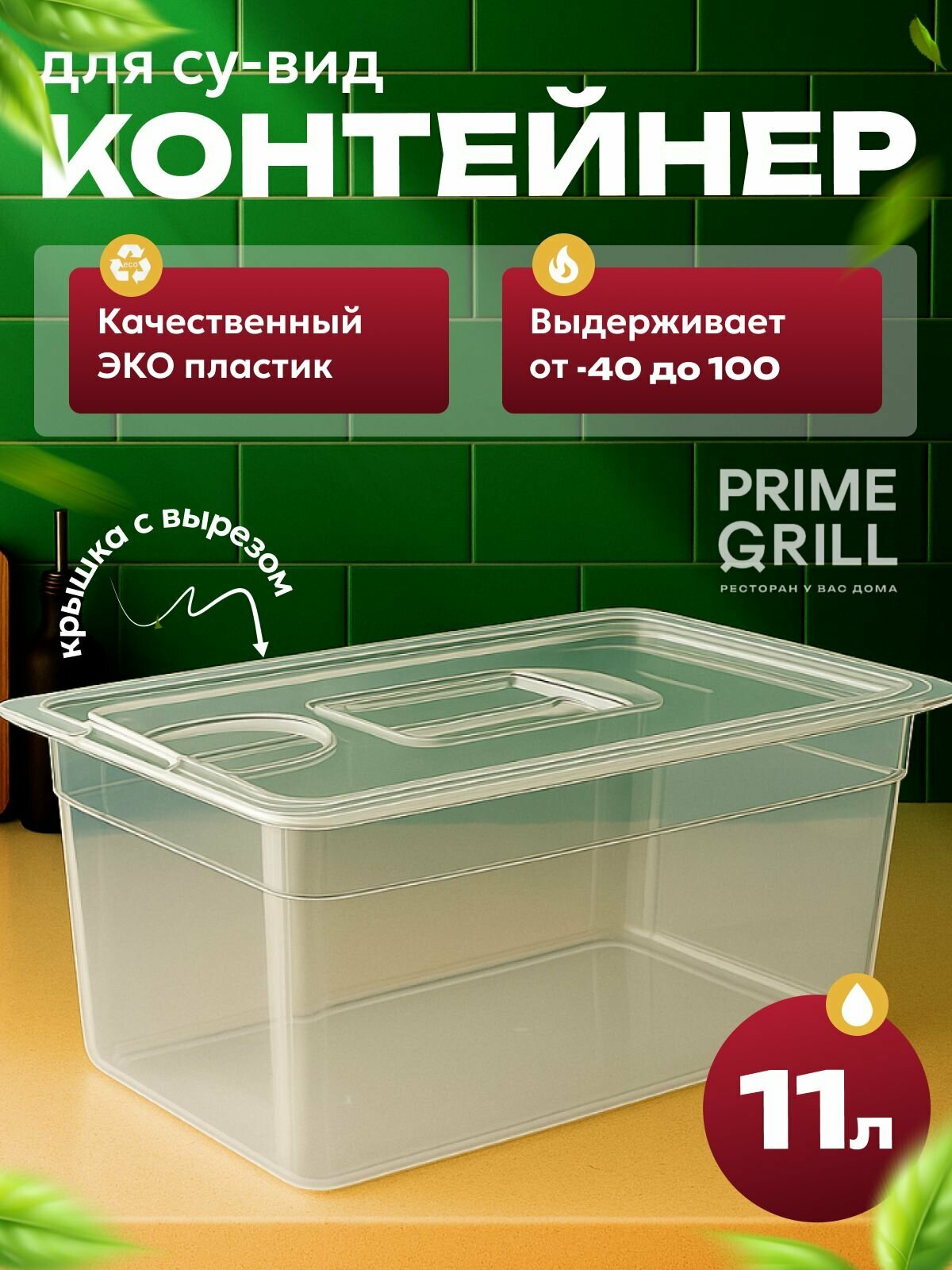 Прозрачный пластиковый контейнер Prime Grill для су-вид с крышкой объемом 11 литров станет незаменимым помощником на вашей кухне и обеспечит качественное приготовление ваших любимых блюд.