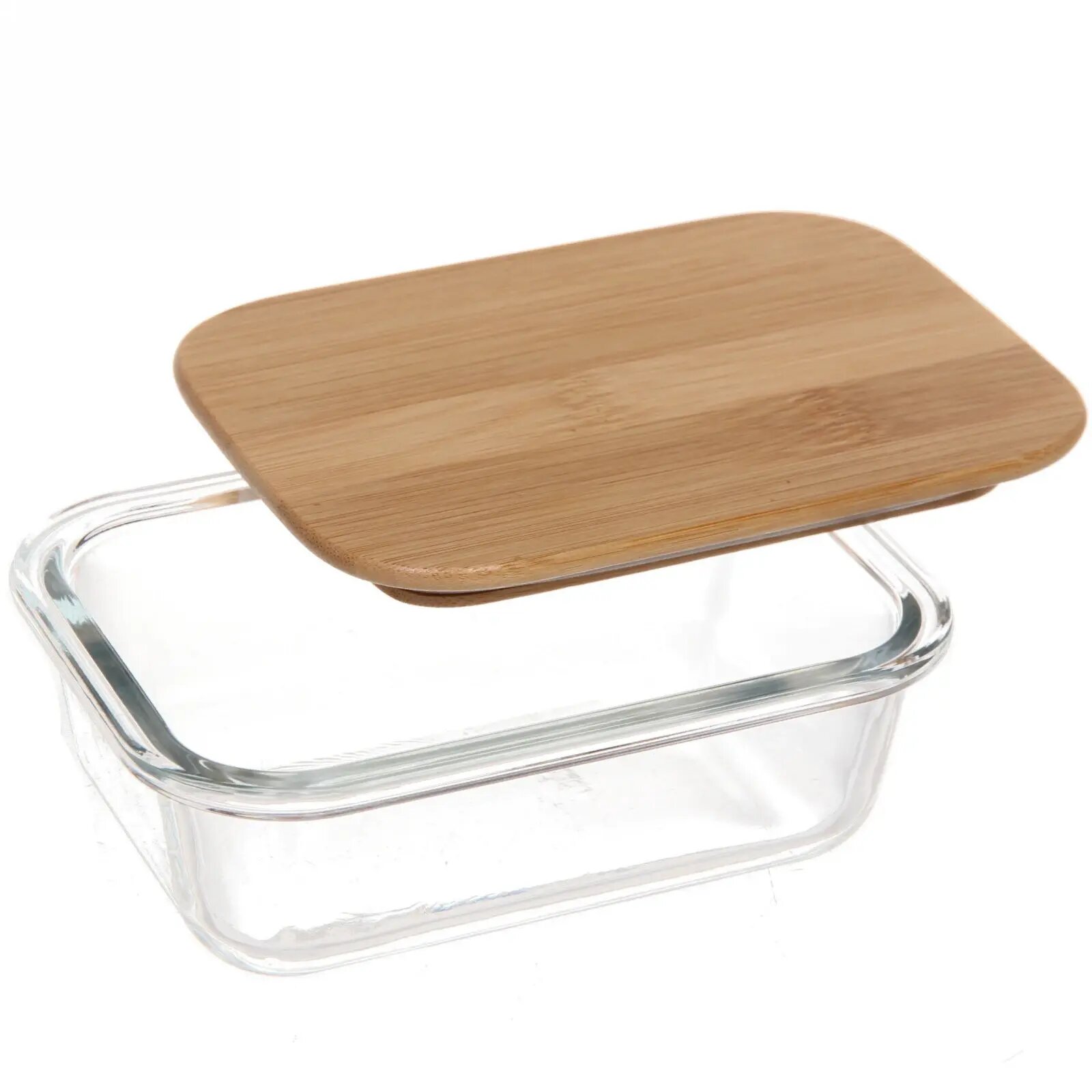 Стеклянный контейнер 700мл «Хай-Тек» квадратный с бамбуковой крышкой