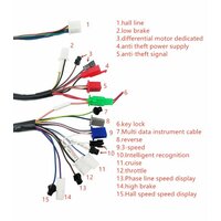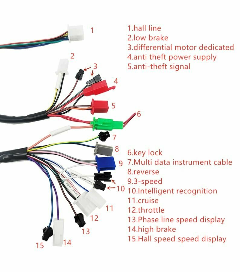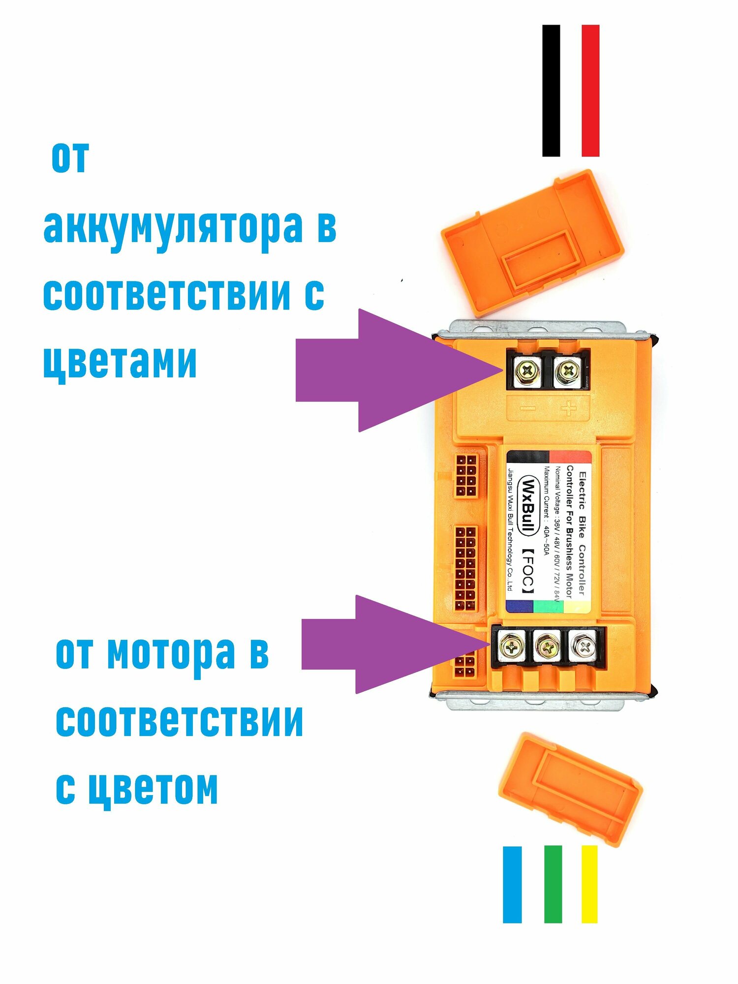Контроллер 36-84v, 1000-2500W 40-50A для электровелосипеда, электросамоката, электроскутера Тип: контроллер бесщеточного мотор-колеса Материал: алюминиевый сплав, пластик Напряжение: 36-84 В универсальный, после подключения линии обучения определите напряжение в соответствии с состоянием батареи. Мощность: 1000-2500 Вт Предел тока: Номинальный ток 45 А, максимальный выход 50 А. Кленнекторы: 1. Линия Холла 2. Низкий тормоз 3. Специальный дифференциальный двигатель 4. Противоугонный источник питания 5. сигнал защиты от кражи 6. Блокировка клавиш 7. Кабель прибора нескольких данных 8. Обратный 9,3 скорости 10. Интеллектуальное Распознавание (линия самообучения) 11. Круиз 12. ручка газа 13. Отображение скорости линии фазы 14. высокий тормоз 15. Отображение скорости Холла. Как подключиться? 1. Аккумулятор и фазные провода в соответствии с цветами провода крепятся к корпусу контроллера (клеммы под защитными крышками сбоку) 2. Подключите линию ручки газа контроллера (цвет к цвету), Подключите электрический замок (Если у вашей дроссельной заслонки нет блокировки клавиш, Блокировка клавиш контроллера может быть закорочена) 3. Подключите линию Холла (если двигатель без линии холла, подключение не требуется) 4. Стыковка двух интеллектуальных линий распознавания, колесо будет двигаться вперед или назад. a. Если колесо вперед, отделите интеллектуальную линию распознавания. b. Если колесо заднее, отделите интеллектуальную линию распознавания. Снова стыкуя интеллектуальную линию распознавания, 5. Другие функции могут быть подключены по мере необходимости.
