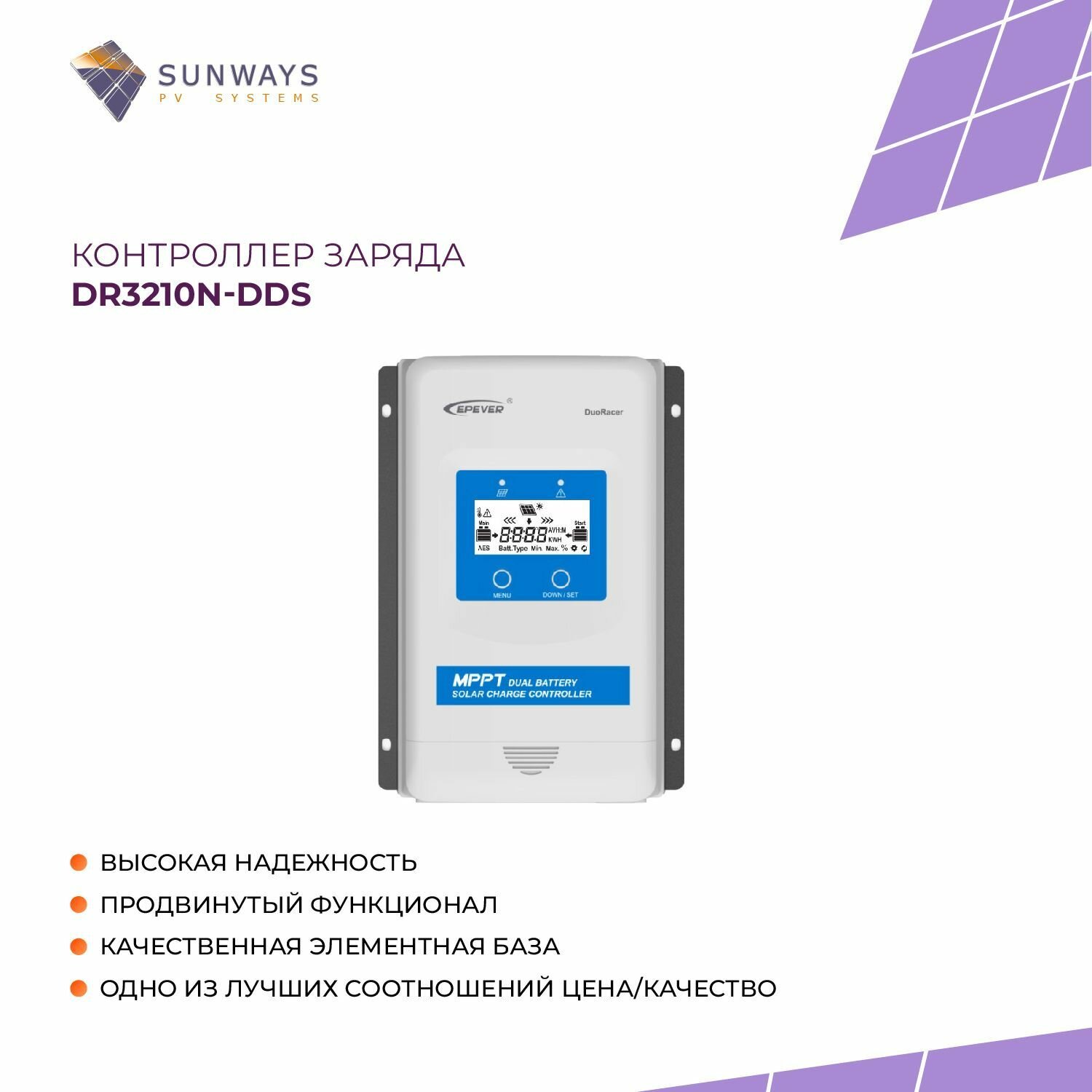 Epever DuoRacer — серия контроллеров, которая специально разработана для солнечных энергосистем в составе катеров, яхт и автодомов. Контроллер имеет с два независимыми выхода на заряд аккумуляторных батарей любого типа (AGM, GEL, Carbon, LifePO4). Два независимых выхода на АКБ позволяют заряжать по отдельности сервисные и стартерные АКБ в системе, даже, если они имеют разный тип и емкость! Контроллеры заряда Epever DR (Duo Racer) получили обновлённый функционал, дизайн и повышенный класс защиты от влаги и пыли IP33. Контроллеры DR (Duo Racer) имеют обновленное программное обеспечение с поддержкой литий ионных аккумуляторных батарей c функцией защиты батареи при заряде в минусовые температуры. Обновленная элементная база и программное обеспечение позволили повысить КПД преобразования солнечной энергии до 99,5%! В сравнении с дешевыми аналогами на основе PWM технологии, новое поколение MPPT контроллеров DR (Duo Racer генерирует до 30% больше энергии за световой день. Новая серия контроллеров выпускается в трех версиях на 10, 20 и 30А мощности. Выносной монитор MT-11 (Опционально) наглядно позволяет отслеживать состояние системы. Расширенный функционал, полный набор электронных защит, высококачественная элементная база и невысокая цена, оставляют аналоги конкурентных брендов далеко позади. Новые контроллеры DR (Duo Racer) – это лучшее решение для построения солнечных энергосистем на борту яхты, катера или автодома!