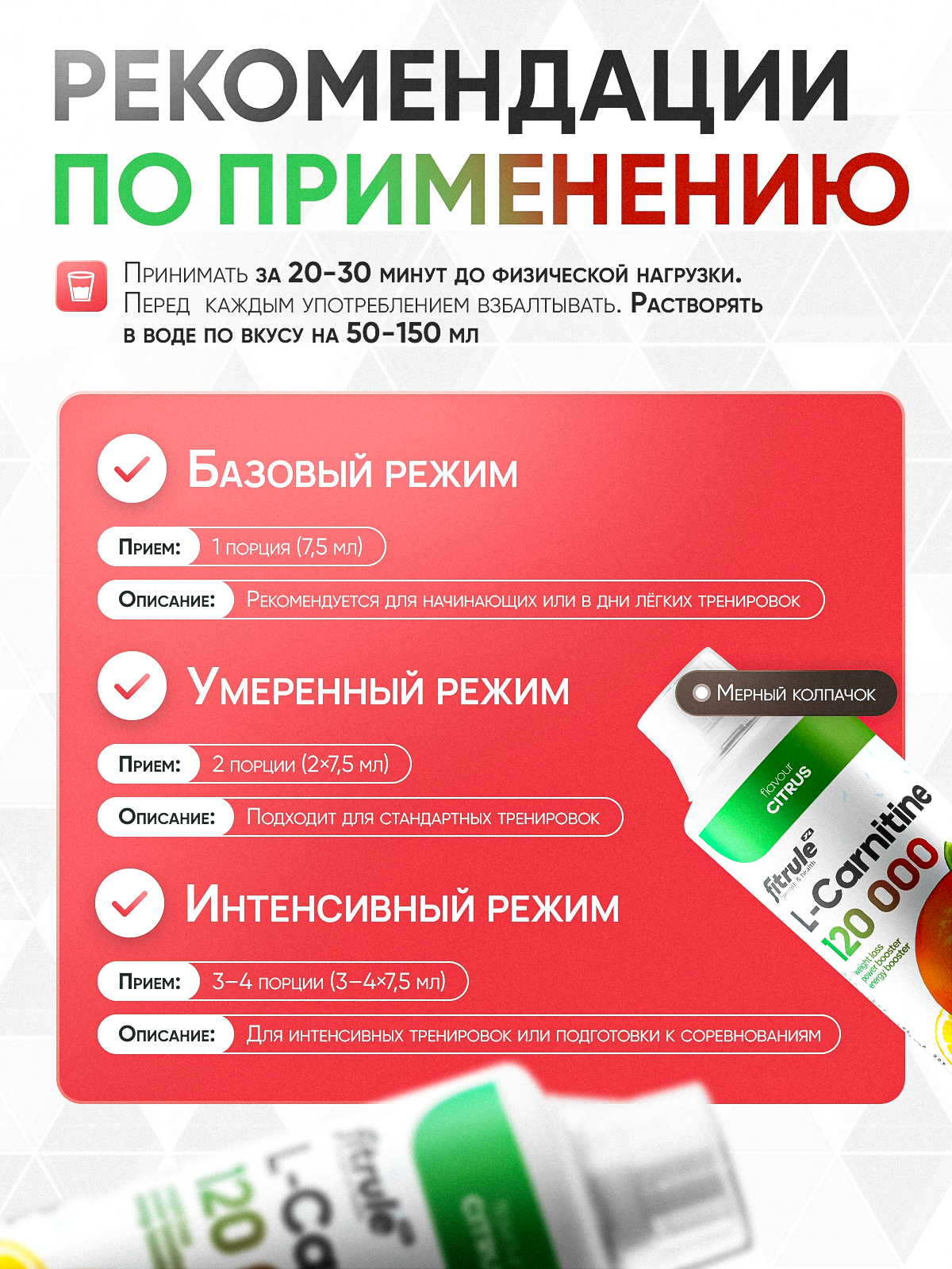 Fitrule L-Carnitine рекомендуется принимать перед или во время тренировки, добавляя 25 мл (1 мерный колпачок) концентрата в воду или любой другой напиток. Это поможет вам получить максимальную пользу от продукта и достичь желаемых результатов.