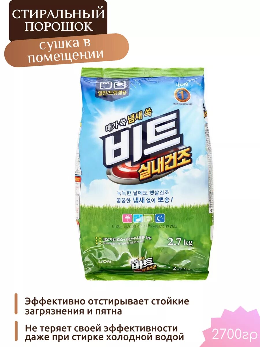 LION Beat in door (Pouch) Концентрированный стиральный порошок для автоматической и ручной стирки Beat in door Сушка в помещении 2,7кгДобро пожаловать в мир высококачественных стиральных порошков! Представляем Вам продукт, который станет незаменимым помощником в борьбе с загрязнениями - Корейский концентрированный стиральный порошок лионМы уже давно занимаемся разработкой и производством стиральных порошков, и с гордостью предлагаем Вам нашу новую разработку - концентрированный стиральный порошок, который обеспечивает безупречную чистоту и свежесть для Ваших вещей. Ключевое преимущество нашего стирального порошка - его концентрация. Маленькое количество порошка обеспечивает мощную стирку и эффективно удаляет самые стойкие загрязнения. Это позволяет сэкономить Ваше время и деньги, так как одной упаковки будет достаточно на долгое время. Уникальная формула порошка LION основана на современных достижениях в области научных исследований. Она позволяет бороться не только с видимыми загрязнениями, но и с глубоко проникшими пятнами, микробами и бактериями. Ваша одежда будет выглядеть как новая после каждой стирки! Наш концентрированный стиральный порошок разработан с учетом особенностей различных тканей, поэтому он идеально подходит для всех видов тканей - от хлопка и льна до шерсти и шелка. Вы можете быть уверены, что ни одна Ваша вещь не пострадает от стресса, вызванного стиркой. Одним из важных аспектов при выборе стирального порошка является его безопасность. Мы гордимся тем, что наш концентрированный стиральный порошок не содержит вредных химических веществ, таких как фосфаты, отбеливатели и красители. Поэтому он безопасен для здоровья Вашей семьи и окружающей среды. Мы понимаем, что Вам важен не только результат стирки, но и приятный аромат на Ваших вещах. Поэтому мы разработали уникальный аромат для нашего стирального порошка - свежий и ненавязчивый. После стирки ваша одежда будет пахнуть нежностью и чистотой на протяжении долгого времени.