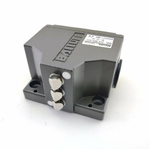 Блочный механический концевой выключатель Balluff BNS 819-B03-L12-61-12-10 артикул BNS0292 с элементом переключения BSE 30.0 (NO/NC 6 А 250 V AC) и подключением через кабельный ввод в терминальный блок с клеммами. Три толкателя с шагом 12 мм. Выключатель BNS819-B03-D12-61-12-10 предназначен для контактного определения конечного положения различных объектов, деталей станков и частей механизмов.