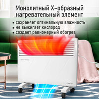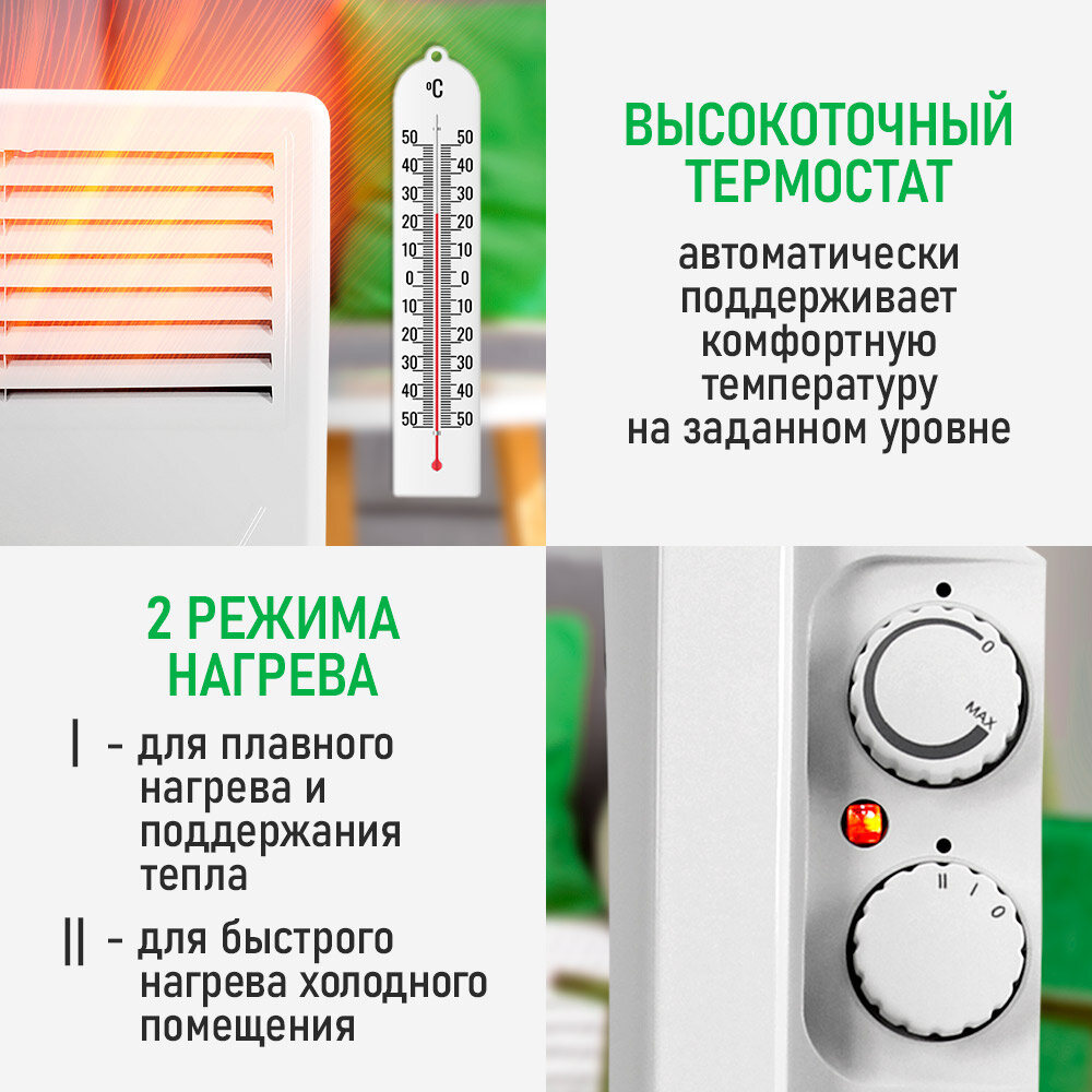 Технология конвекционного нагрева обладает максимальной теплоотдачей и энергоэффективностью, по сравнению с обогревателями других типов. Монолитный Х-образный алюминиевый нагревательный элемент нового поколения нагревается моментально после включения прибора. Распространение тепла происходит плавно и равномерно за счет естественной циркуляции нагретого воздуха. Прибор работает абсолютно бесшумно.