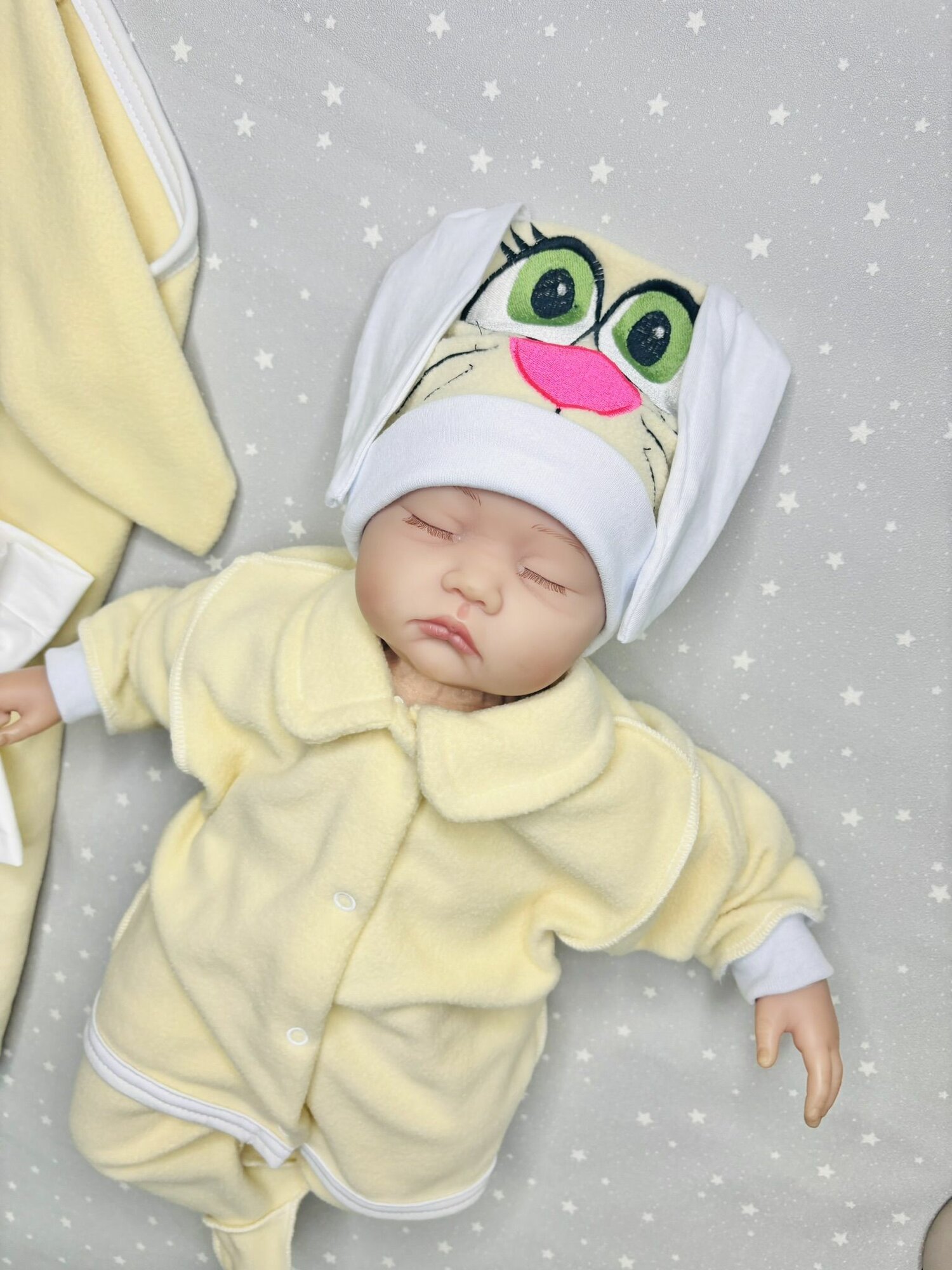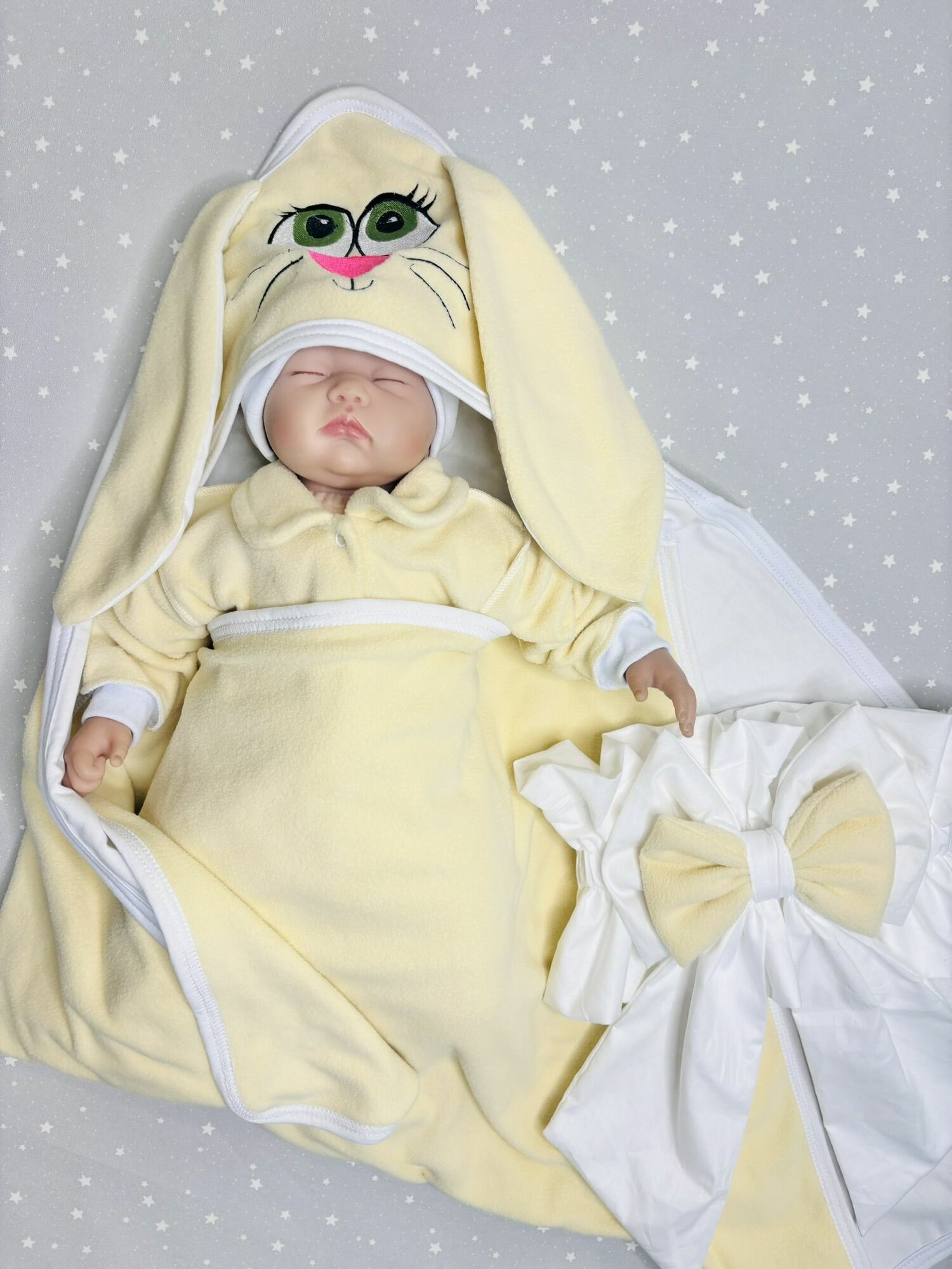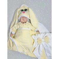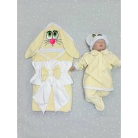 Особенностью конверта является его дизайн. Забавные ушки зайчика и вышивка мордочки придают конверту особое очарование. Застежка на кнопки обеспечивает удобство использования и надежную фиксацию.