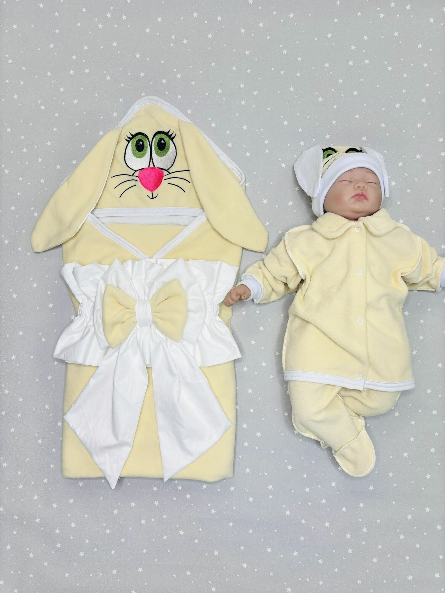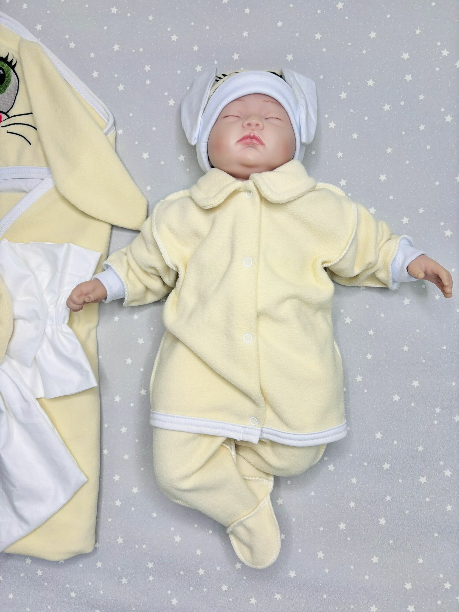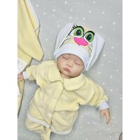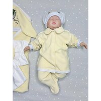В комплект входит одеяло-уголок, которое можно использовать как одежду для новорожденных мальчиков и девочек. Также в комплект входит шапочка и костюм с кофточкой и ползунками.