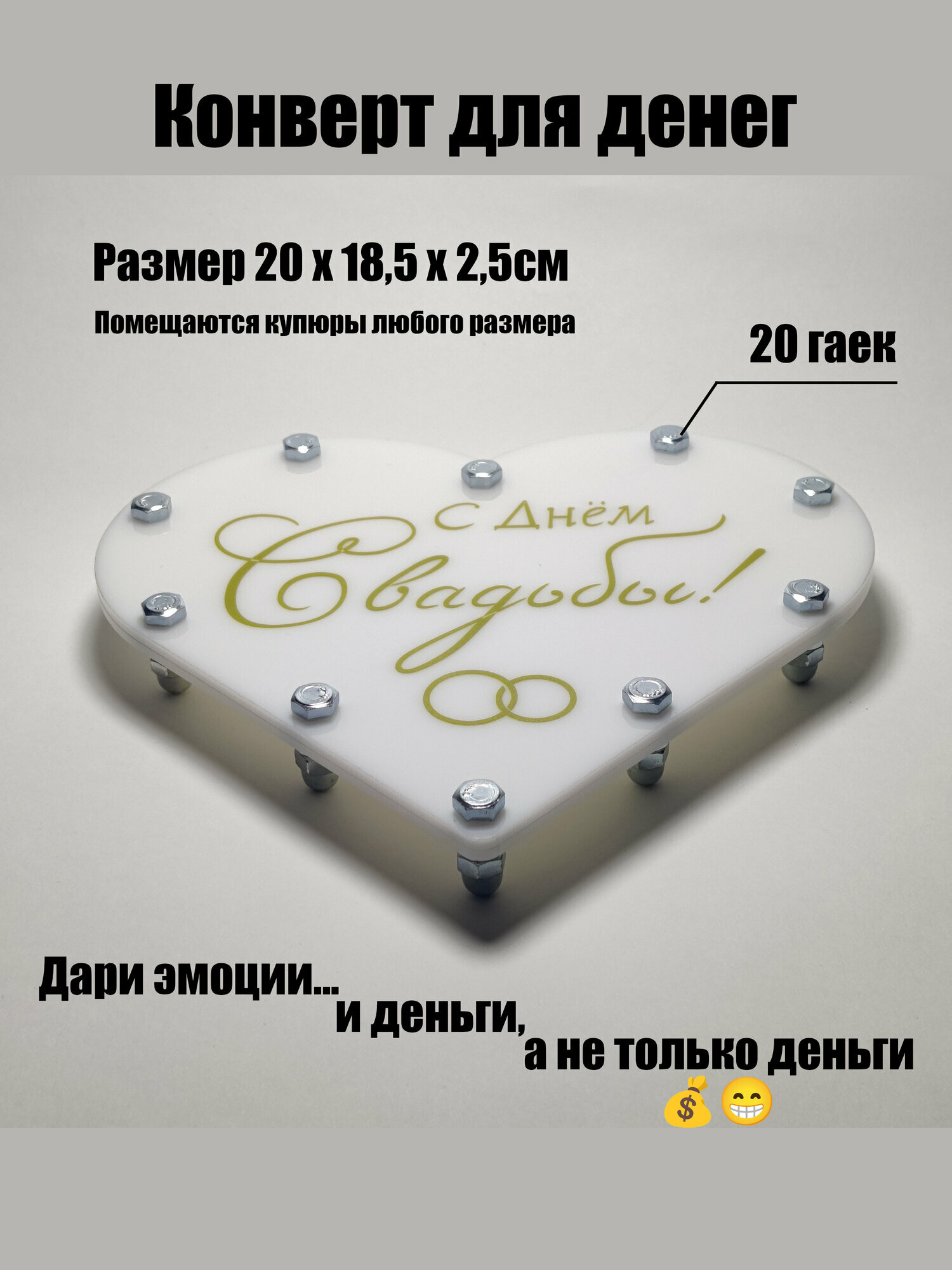Конверт для денег на свадьбу «Сердце С Днём свадьбы» / 20 гаек (Фон: Белый, Текст: Золотой): сравнение цен, характеристики, фото, актуальное наличие и цены.