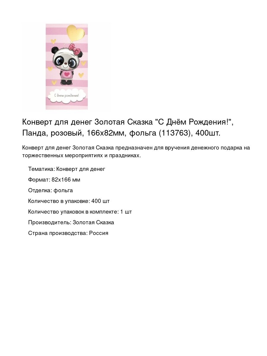 Конверт для денег Золотая Сказка «С Днём Рождения!», Панда, розовый, 166х82мм, фольга (113763), 400шт.: сравнение цен, характеристики, фото, актуальное наличие и цены.
