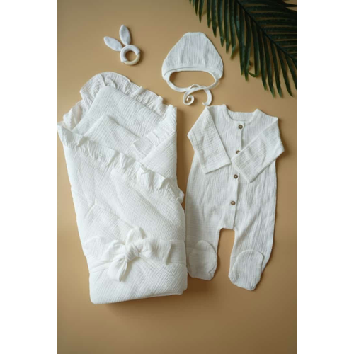 Комплект на выписку из 4 предметов 1. Одеало конверт размером 100/100 2. Лента - Бант , с помощью которой завернуть ребенка 3. Комбинезон на кнопочках 56-62 размера, швы наружу 4. Чепчик для новорождённого, швами наружу . Легко стирается в стиральной машинке, быстро сохнет и не требует глажки. Кожа малыша дышит и не преет в жару . КОНВЕРТ на выписку выполнен из ПРЕМИАЛЬНОГО МУСЛИНА .