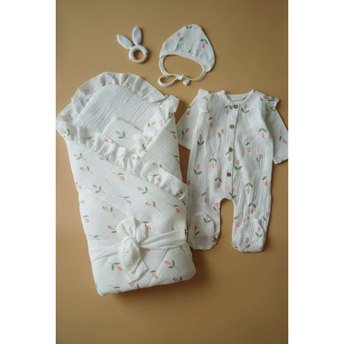 Муслиновый конверт сезон лето Комплект на выписку из 4 предметов представляют собой 1. Одеало конверт размером 100/100 2. люЛента - Бант , с помощью которой легко завернуть конверт под любой рост ребёнка . 3. Комбинезон на конопочках 56-62 размера, швами наружу . 4. Чепчик для новорождённого, швами наружу . Легко стирается в стиральной машинке, быстро сохнет и не требует глажки. Кожа малыша дышит и не преет в жару . конверт на выписку выполнен из премиального муслина . Муслин тонкая дышащая ткань , очень мягкая и нежная , идеально для летней выписки из роддома .