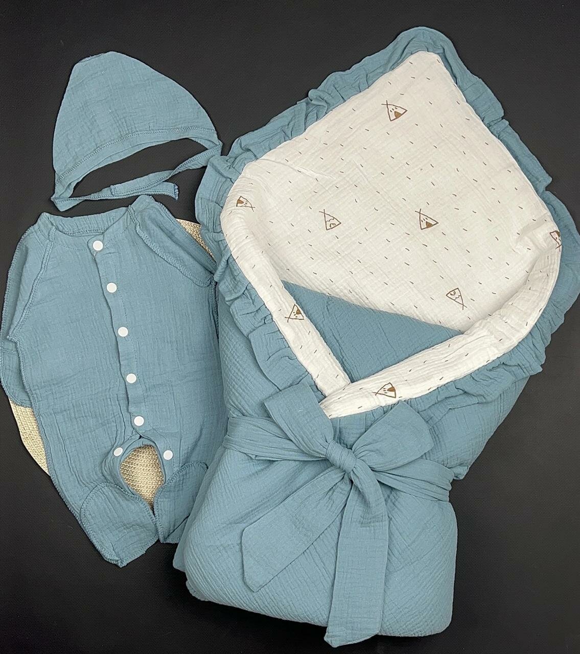 Купить Конверт для новорожденного из муслина на выписку в роддом на прогулку голубой 14 с доставкой по всей России.