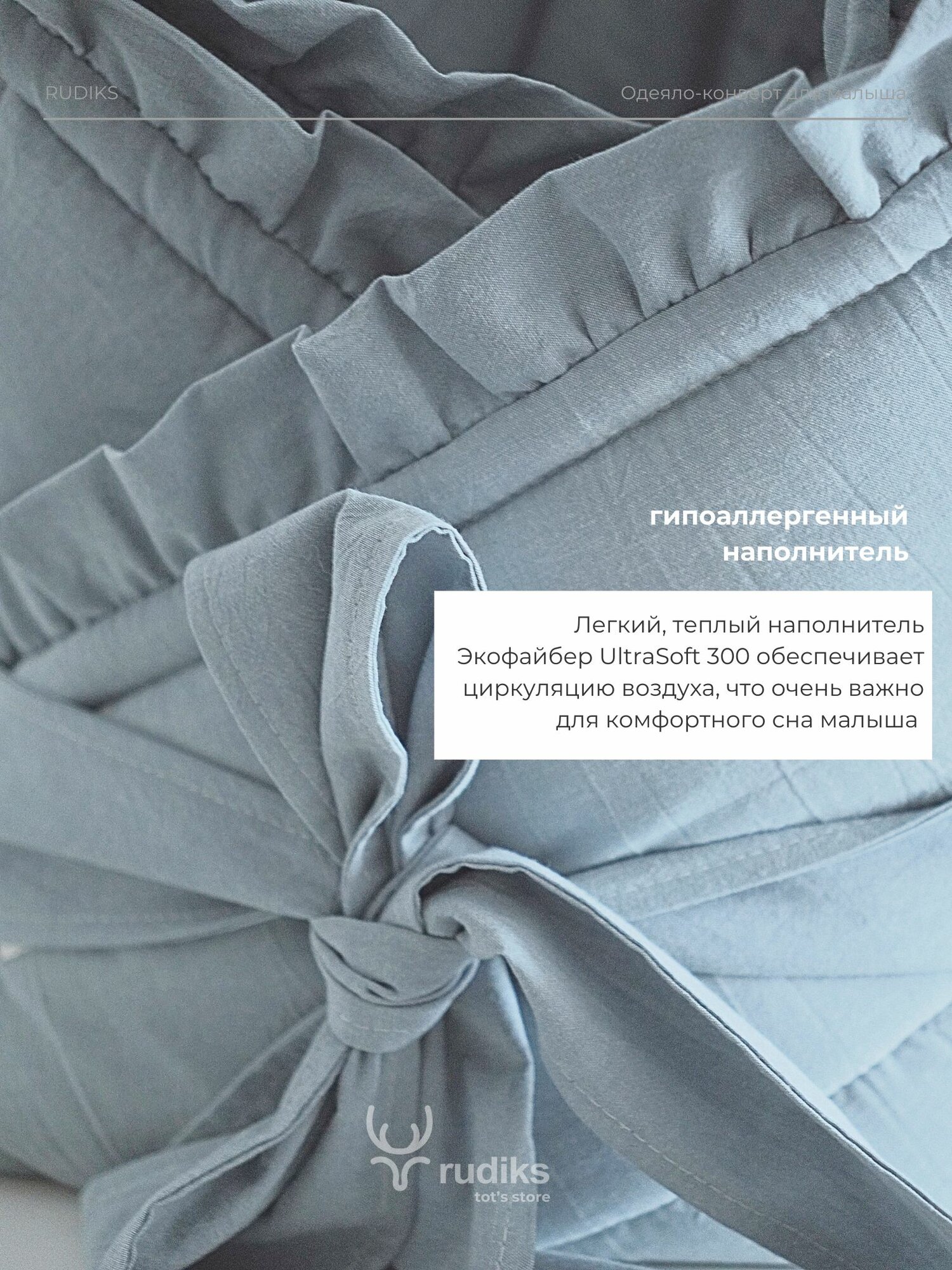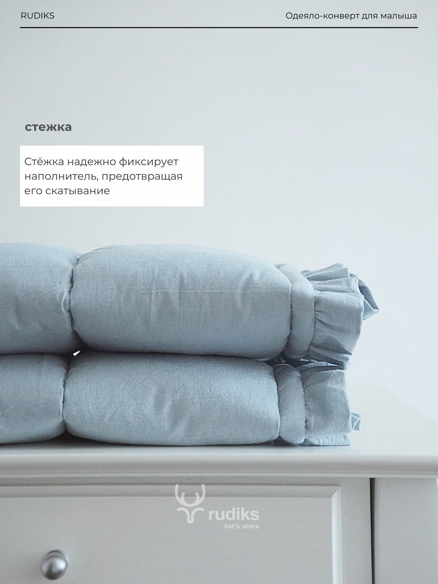 Конверт на выписку для новорожденных RUDIKS можно использовать в любое время года, сочетая с сезонной детской одеждой. Он выполнен из 100%-го хлопка, что обеспечивает комфорт и мягкость при соприкосновении с кожей ребенка.