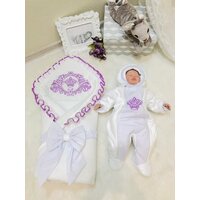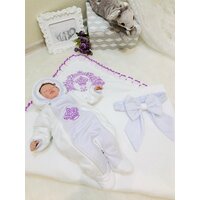 В набор входит одеяло-конверт с вышивкой и рюшами, велюровый комбинезон с вышивкой, а также шапочка велюровая на завязочках и бант на резинке.