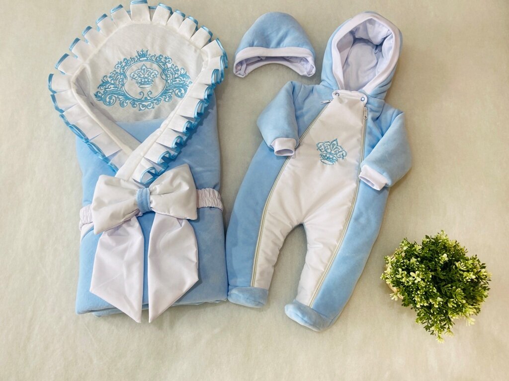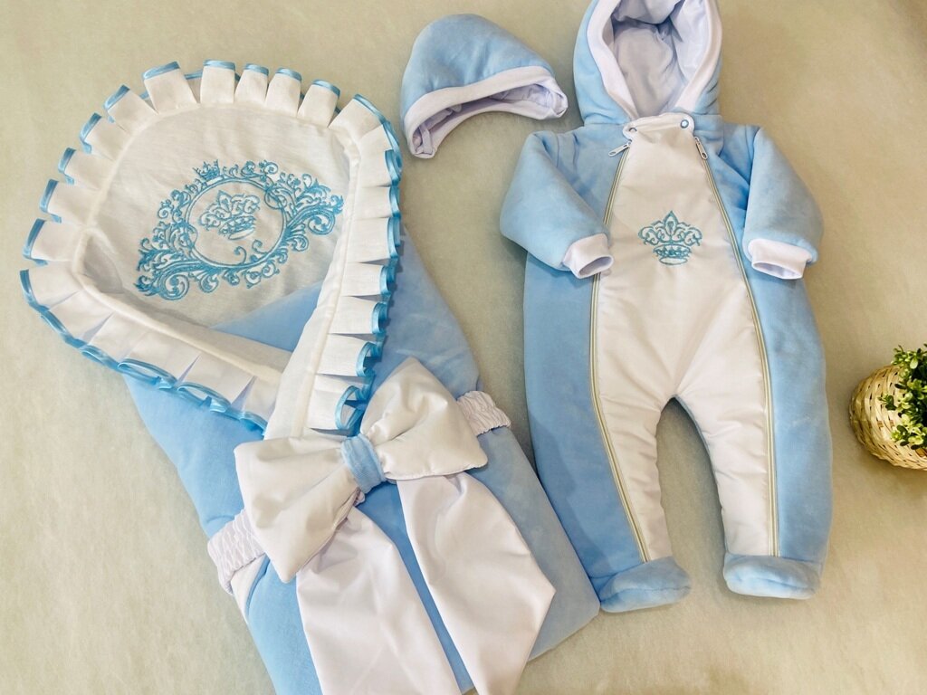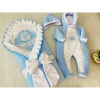 В набор входит одеяло-конверт с вышивкой и рюшами, велюровый комбинезон с вышивкой, а также шапочка велюровая на завязочках и бант на резинке.