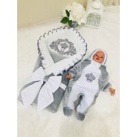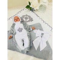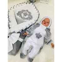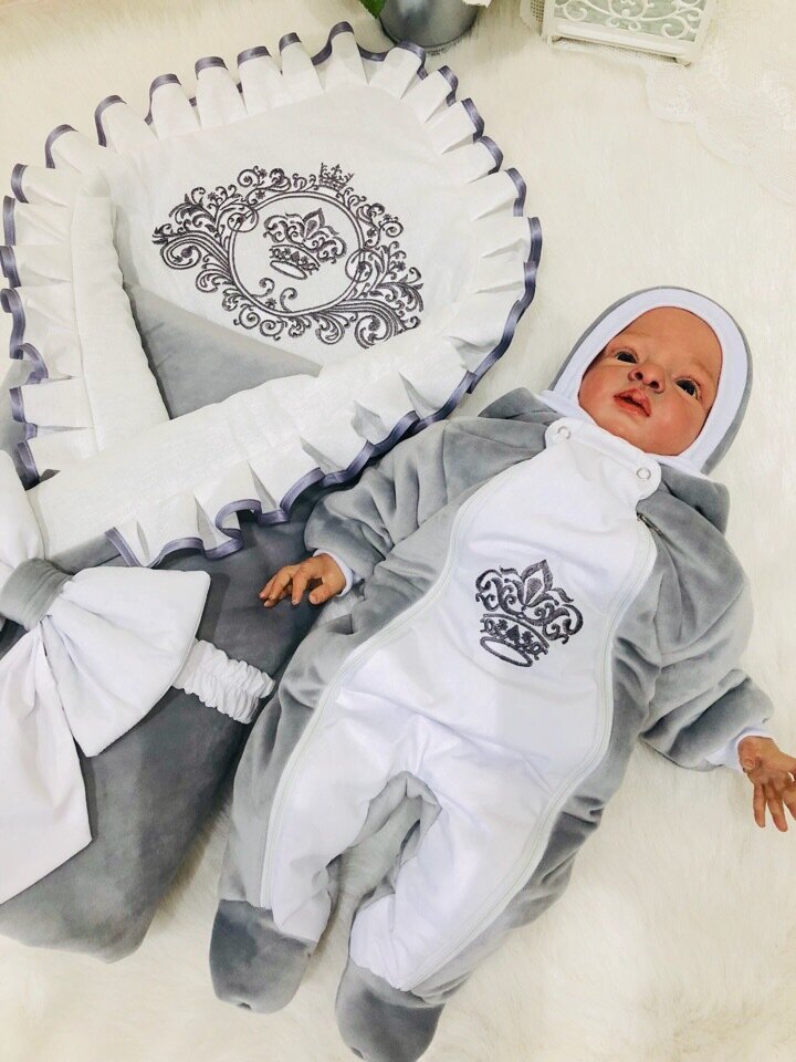 В набор входит одеяло-конверт с вышивкой и рюшами, велюровый комбинезон с вышивкой, велюровая шапочка на завязочках и бант на резинке.