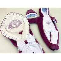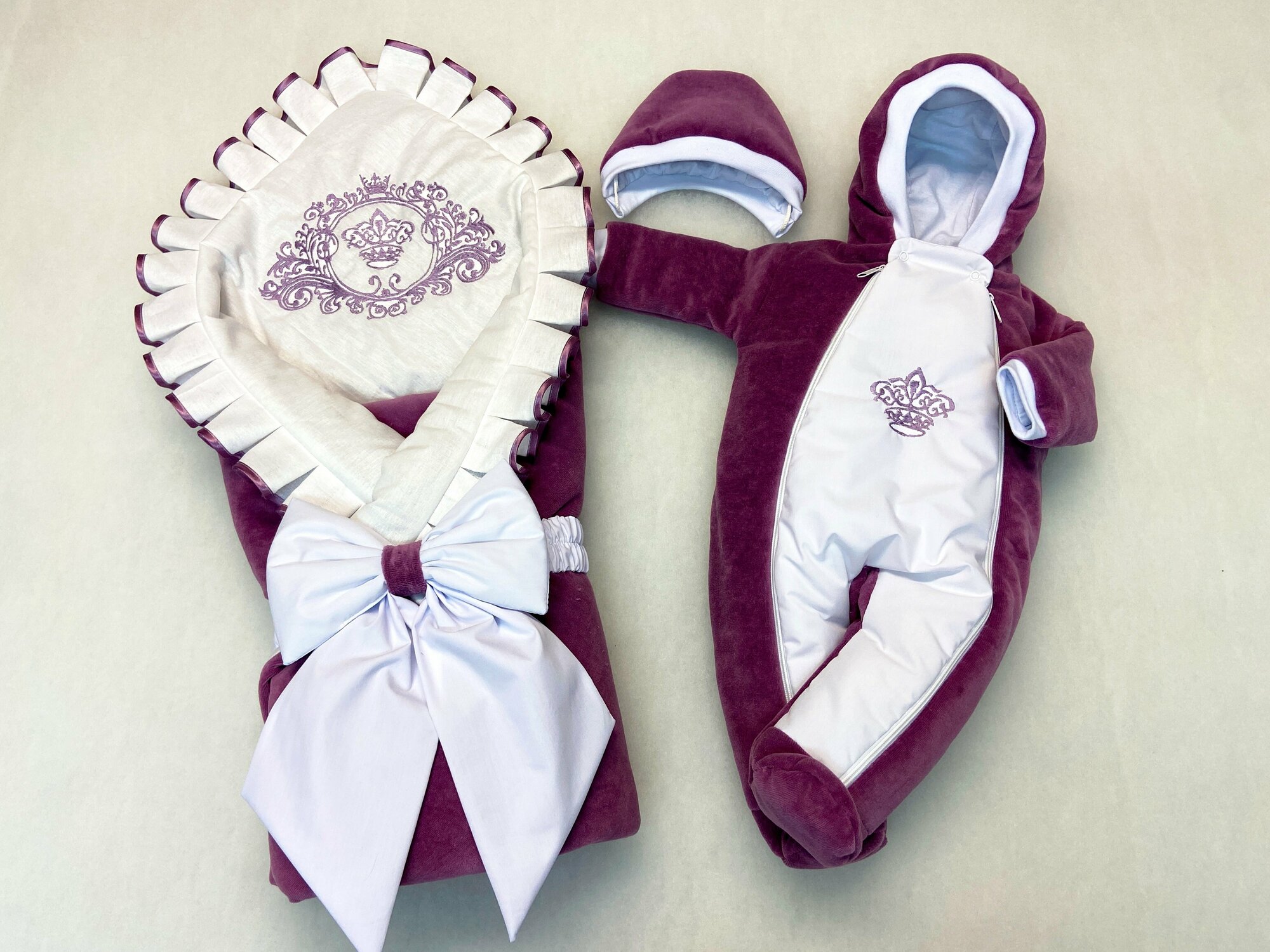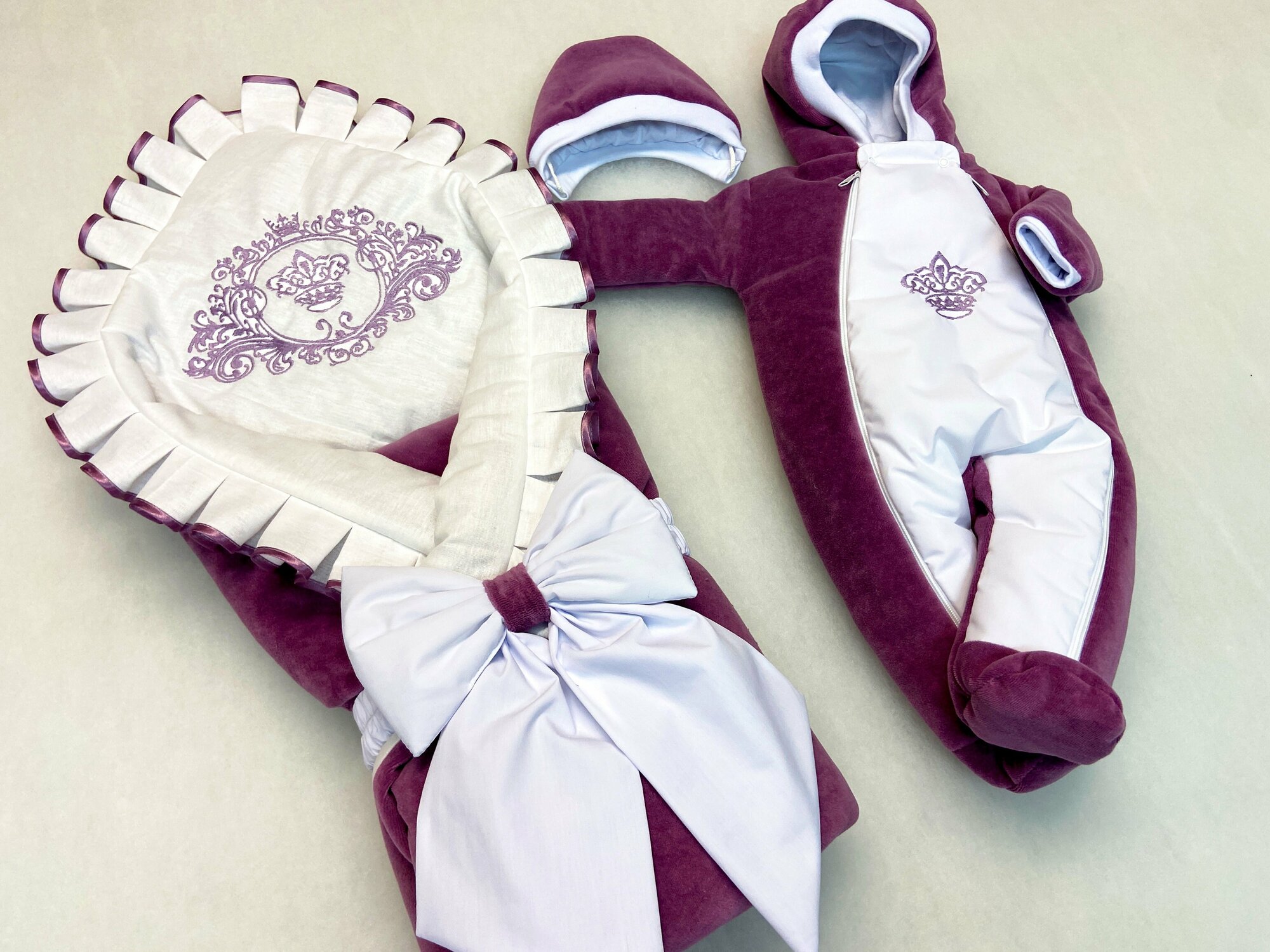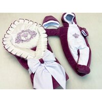 Комплект включает в себя не только одеяло-конверт, но и велюровый комбинезон с вышивкой, а также велюровую шапочку на завязочках. Бант на резинке завершает образ и делает его еще более праздничным.