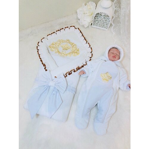 Детский комплект для новорожденных малышей на торжественную выписку из роддома "Королевский" Быстро и легко превращается из одеяла в детский конверт и крепится резинкой с бантом. Одеяло можно использовать в дальнейшем в коляске на прогулке и кроватке дома. Комбинезон вообще незаменимая вещь в детском гардеробе Одеяло для мальчиков и девочек произведено с двух сторон из 100% гипоаллергенного хлопка (велюр, бязь) внутри утеплитель синтепон. Комплект декорирован нежнейшей вышивкой. В набор входит: *одеяло-конверт с вышивкой и рюшами *комбинезон велюровый с вышивкой *шапочка велюровая на завязочках *бант на резинке
