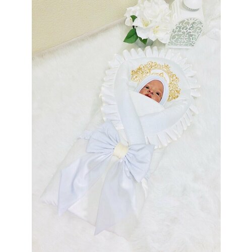 Детский комплект для новорожденных малышей на торжественную выписку из роддома "Королевский" Быстро и легко превращается из одеяла в детский конверт и крепится резинкой с бантом. Одеяло можно использовать в дальнейшем в коляске на прогулке и кроватке дома. Комбинезон вообще незаменимая вещь в детском гардеробе Одеяло для мальчиков и девочек произведено с двух сторон из 100% гипоаллергенного хлопка (велюр, бязь) внутри утеплитель синтепон. Комплект декорирован нежнейшей вышивкой. В набор входит: *одеяло-конверт с вышивкой и рюшами *комбинезон велюровый с вышивкой *шапочка велюровая на завязочках *бант на резинке