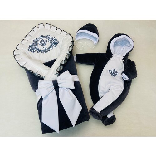Детский комплект для новорожденных малышей на торжественную выписку из роддома "Королевский" Быстро и легко превращается из одеяла в детский конверт и крепится резинкой с бантом. Одеяло можно использовать в дальнейшем в коляске на прогулке и кроватке дома. Комбинезон вообще незаменимая вещь в детском гардеробе Одеяло для мальчиков и девочек произведено с двух сторон из 100% гипоаллергенного хлопка (велюр, бязь) внутри утеплитель синтепон. Комплект декорирован нежнейшей вышивкой. В набор входит: *одеяло-конверт с вышивкой и рюшами *комбинезон велюровый с вышивкой *шапочка велюровая на завязочках *бант на резинке