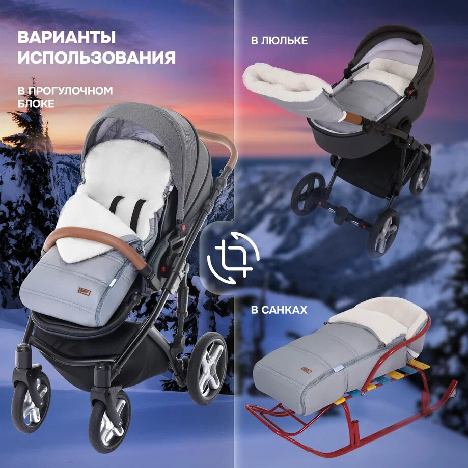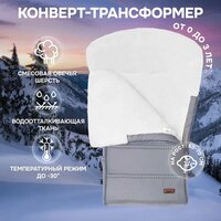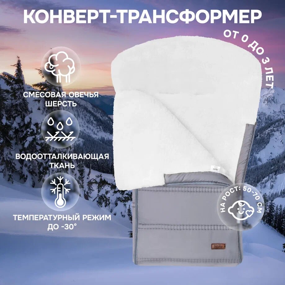 Основа конверта — смесовая овечья шерсть, которая имеет густой и теплый ворс высотой 12 мм. Благодаря природным качествам шерсти внутри конверта обеспечивается оптимальная терморегуляция. Слой синтепона создает дополнительную мягкую прослойку, не утяжеляя изделие (вес конверта всего 0,65кг).