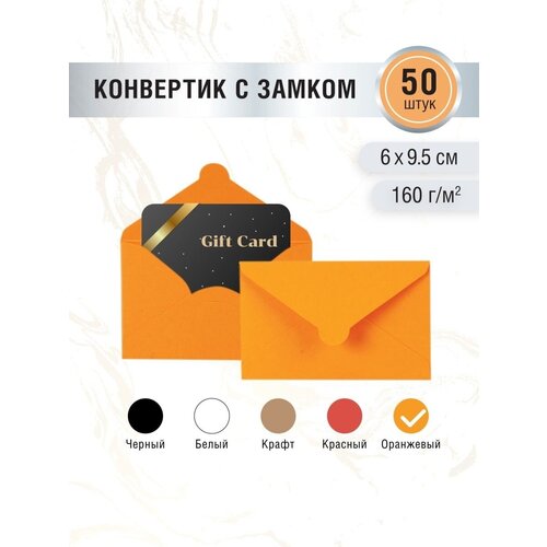 Оранжевый конвертик мини 95х60 мм с замком. Плотная бумага 160 г/м2, в два раза толще стандартной бумаги 80 г/м2. Набор - 50 штук плюс один конверт в подарок. Упакованы в плотную коробку, в которой они не только защищены при транспортировке, но и их можно в ней хранить и использовать по мере необходимости.