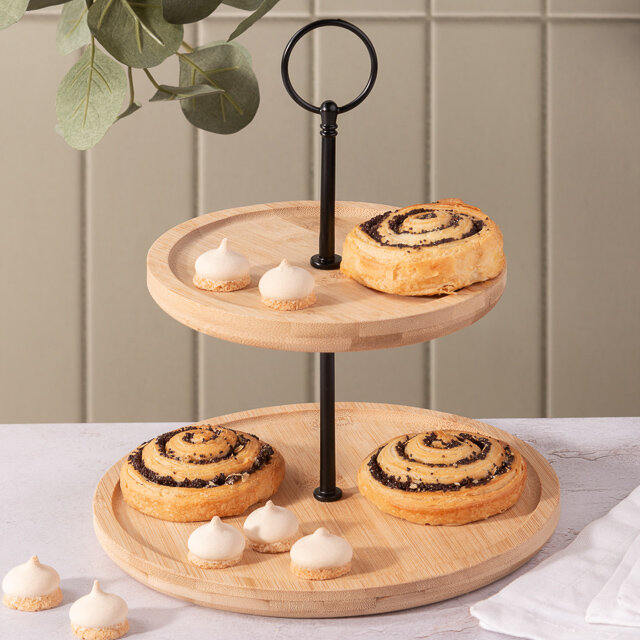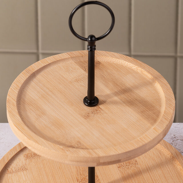 Этажерка для сервировки Теофила выглядит элегантно, но без лишнего лоска. Светлый полированный бамбук создает ощущение уюта, металлический стержень - надёжности, а лишённый изысков декор делает подставку для закусок и сладостей уместной на любом застолье. Простенькие канапе, груды фруктов, отборные деликатесы? Что бы ни разместилось на круглых полках этажерки для стола, всё будет смотреться удачно!