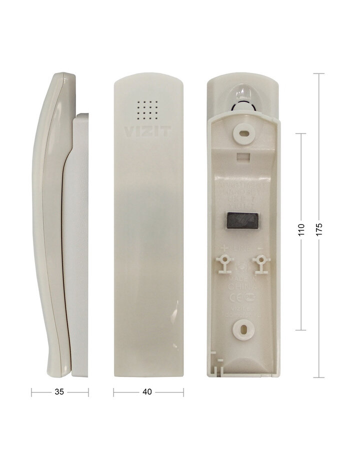 предназначено для работы в составе домофонов VIZIT (серии 300, 400, SM, N, M) в качестве абонентской трубки; кнопка отпирания замка; ступенчатая регулировка громкости вызова; дуплексная связь; диапазон рабочих температур от +1°C до +45°C; вес не более 0,11 кг
