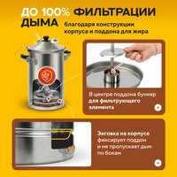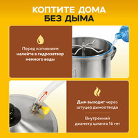 Благодаря конструкции купольная крышка оберегает продукты от выделяющихся в процессе готовки паров и смол. Они просто стекают вниз по стенкам коптильни, а не капают на еду. Гидрозатвор не пропускает дым в помещение, также он важен мужчинам и женщинам, которые будут коптить в квартире. Весь дым будет уходить через специальную трубку, к которой можно присоединить шланг и вывести его в окно или вытяжку. В коптильной камере для дома ингредиенты будут равномерно коптиться со всех сторон. Ручки выполнены из полиамида - максимальная долговечность и безопасность при использовании, а вы не обожжете руки.