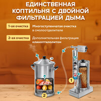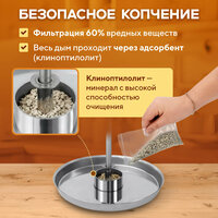 Купольная крышка препятствует попаданию конденсата на продукт. Благодаря гидрозатвору дым не проникнет в квартиру, а электронный термометр обеспечит точное определение температуры на протяжении всего процесса горячего копчения.