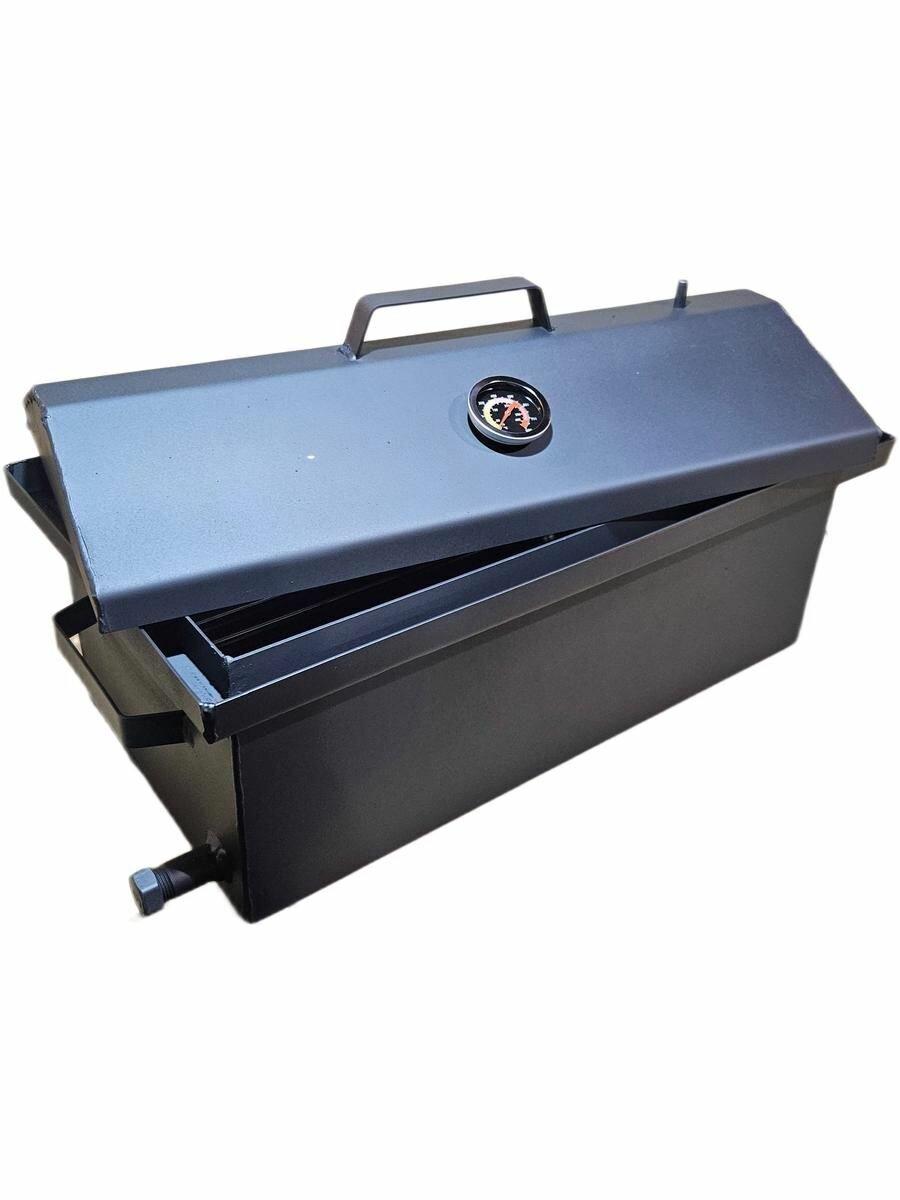 Коптильня горячего копчения 500 мм с гидрозатвором с термометром изготовлена из прочной стали толщиной 3 мм. Она станет незаменимым помощником в приготовлении вкусных и ароматных блюд на пикнике или во дворе вашего дома. Крышка сделана домиком, что обеспечивает сход конденсата в гидрозатвор. Коптильня имеет выход с резьбой 1/2 дюйма для подключения дымогенератора. Благодаря прочной стали толщиной 3 мм, она обладает высокой стойкостью к механическим повреждениям и долгим сроком службы. Простота использования - еще одно преимущество этой коптильни. С помощью термометра можно контролировать необходимую температуру, решетки из нержавейки легко очищаются, а поддон для сбора жира сохранит щепу сухой. Корпус выполнен из стали толщиной 3мм, боковины из 1.5мм, крышка 1.5мм Габариты корпуса 500х250х190