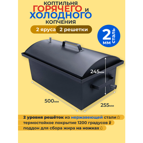 Коптильня горячего и холодного копчения - идеальное решение для ценителей наилучших копченых рыбных и мясных блюд. Изготовлена из прочной стали 2мм, что обеспечивает равномерное распределение тепла и даёт Вам наслаждение насыщенным вкусом копченостей, приготовленных на природе или в домашних условиях. Благодаря своим большим размерам 50х25х24см и двум уровням решеток из нержавеющей стали внутрь легко поместиться много ваших любимых продуктов. Универсальность модели позволяет готовить как на улице так и в помещении благодаря наличию гидрозатвора. Полукруглая крышка в форме сферы увеличивает объем и исключает капанье конденсата и дегтя на продукты, направляя его по своду в гидрозатвор. Поддон для сбора жира на ножках снижает возможность возгорания щепы. Оснащена штуцером для подключения дымогенератора холодного копчения (в комплект не входит).