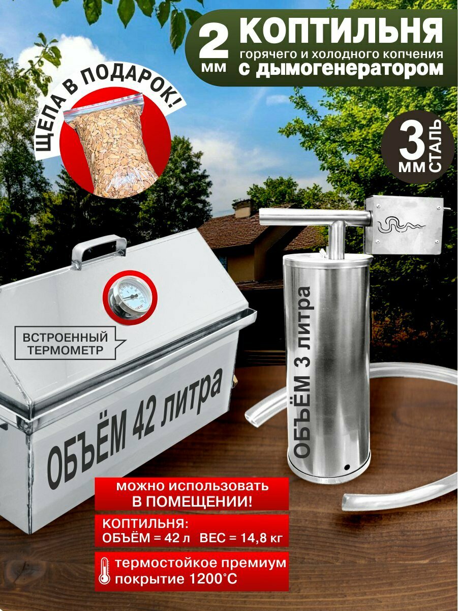 ключевые преимущества: · Идеально для дома, дачи, балкона: Компактный размер и безопасность гидрозатвора позволяют коптить даже в городской квартире. · Простота использования: Собрал, засыпал щепу, разложил продукты — и через полчаса наслаждаешься вкуснейшим блюдом! · Экономия: Готовые копчености в магазине стоят дорого, а вы контролируете качество и состав. Окупается за 2-3 использования! · Вкус и польза: Никакой химии, жидкого дыма и консервантов! Только натуральные продукты и древесная щепа. ЧТО можно приготовить? Рыба горячего копчения, куриные окорочка, крылышки, свиные ребрышки, сало, бекон, домашние колбаски, сыр, орехи, овощи-гриль и даже фрукты! Сделайте шаг к новому хобби и здоровому питанию! Добавьте в корзину и откройте для себя мир настоящих копченых деликатесов уже сегодня!
