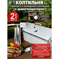 В коробке вы найдете всё для старта: · Сама коптильня из нержавеющей стали · Мощный дымогенератор · Крышка с термометром (для контроля температуры) · Поддон для сбора жира · Решетки для продуктов · Инструкция с рецептами
