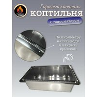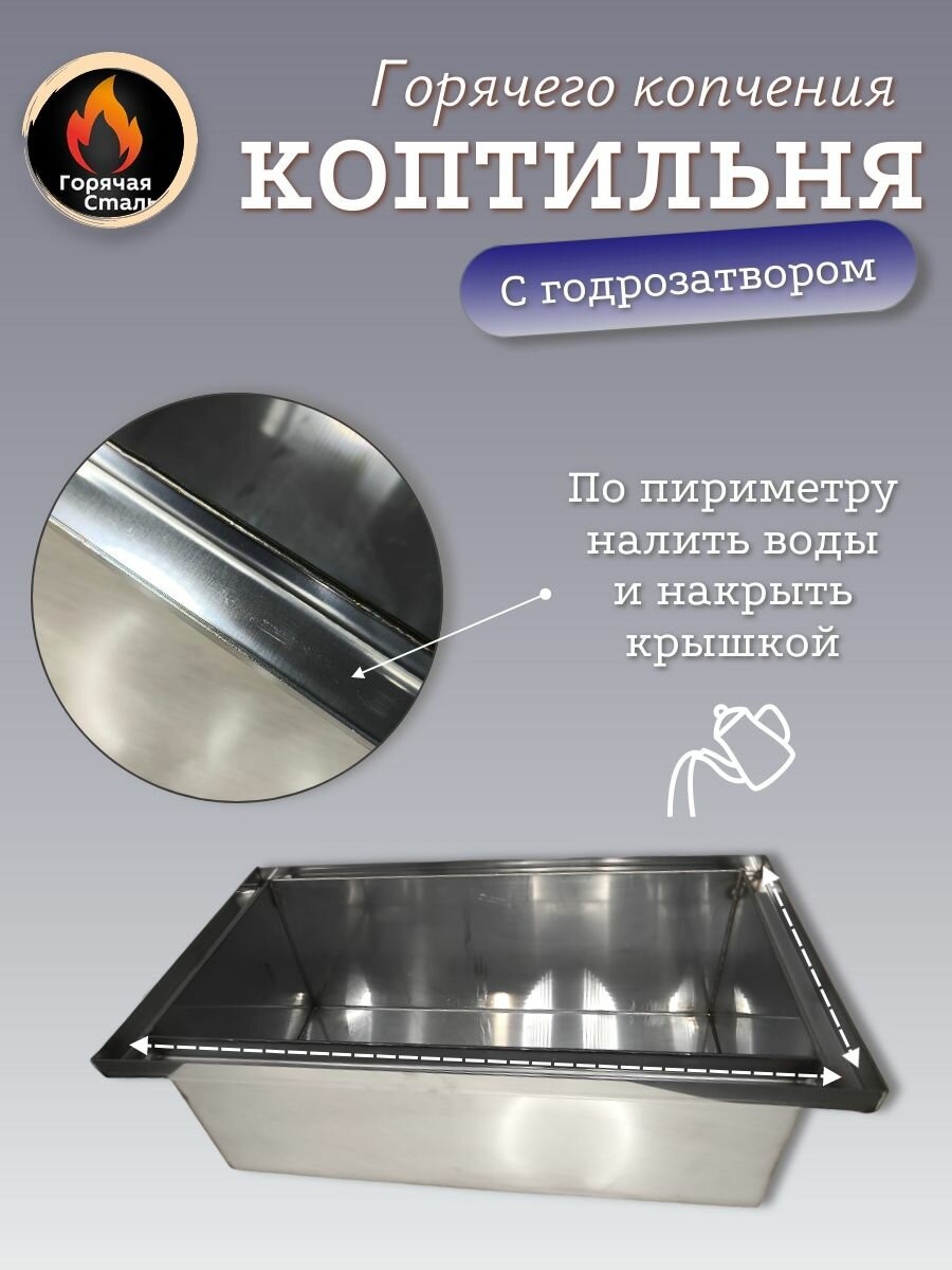Коптильня горячего копчения закрывается крышкой с гидрозатвором. В бортики крышки заливается вода, которая блокирует выход дыма в помещение. В процессе копчения продуктов выкипевшую воду из крышки можно долить.