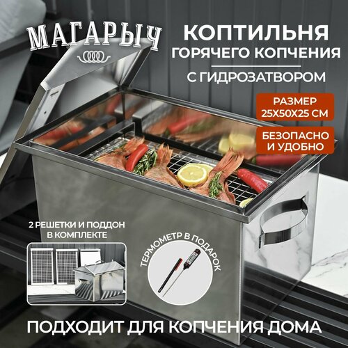 Коптильня из нержавеющей стали магарыч 25х50х25см с гидрозатвором и электронным термометром в комплекте, в отличии от мангала, отлично подходит для копчения в домашних условиях, так и на природе, в походе, кемпинге или на даче. Коптить можно на любом источнике тепла нужной температуры, в том числе и на открытом огне и углях. Крышка не пропустит дым от копчения в квартиру за счет надежного гидрозатвора, достаточно налить немного воды.