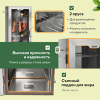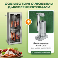 Коптильня-шкаф Ханхи на 53 литра изготовлена из пищевой нержавеющей стали AISI 430 толщиной 0,8 мм. Металл не подвержен коррозии и не выделяет вредных веществ, которые могут исказить вкус продуктов. Высота домашнего заготовщика – 78 см, ширина – 34 см, длина – 20 см.