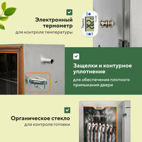 Следить за процессом приготовления блюд можно через прозрачную дверцу коптилки для рыбы холодного копчения. Она сделана из прочного органического стекла. Оно не гнется и не растрескивается при эксплуатации. Дверца вертикального коптильного шкафа имеет контурное уплотнение.