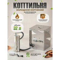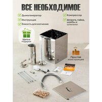 Коптильня холодного копчения Дым Дымыч 01Б предназначена для создания вкуснейших и ароматных копченостей на природе или дома. Коптильня для рыбы представляет собой простой дымогенератор, оснащенный принудительной подачей дыма в коптильную камеру. Такой процесс может длиться от нескольких часов до нескольких дней (время копчения зависит от типа продукта и степени прокопченности продукта которую вы хотите получить). В процессе холодного копчения натуральным густым дымом с температурой 19-40 градусов из мяса или рыбы выводятся все вредоносные микроорганизмы и бактерии, срок хранения такой пищи увеличивается, а вкусовые качества усиливаются. Емкость для копчения 32 литра, что позволяет одновременно коптить до 3 кг свежей рыбы или мяса, удовлетворяя потребности большой компании. Одной из главных особенностей коптилки является нижняя подача дыма, которая обеспечивает экономичное использование щепы и равномерное распределение дыма внутри шкафа. Коптильня изготовлена из нержавеющей стали толщиной 0,8 мм, имеет прочные сварные швы, что придает ей надежность и устойчивость. Коптильня мобильная и не займет много места дома или в багажнике автомобиля при выезде на природу. Характеристики коптильни для мяса: материал корпуса – нержавеющая толщиной 0,8 мм; вес комплекта: 4900 г; объём дымогенератора рассчитан на 0,5 - 0,6 кг древесной щепы; производительность компрессора: 2,5 х 2 л/мин; мощность компрессора: 2,9 Вт; давление компрессора: 0,012 МПа; работа от сети: 220-240 В. Комплектация включает все самое необходимое, чтобы сразу приступить к использованию: дымогенератор, емкость для копчения, компрессор, шланги, гайки, шайбы и шпильки, инструкция. Коптилка холодного копчения станет отличным подарком туристам, охотникам, рыболовам и тем, кто любит деликатесы собственного производства «с дымком». Коптильни средства для копчения производятся в городе Челябинск.