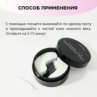 | Способ применения | С помощью пинцета вынимайте по одному листу и прикладывать его к чистой коже вокруг глаз. Оставьте на 5-10 минут затем снимите патч и распределите эссенцию, оставшуюся на коже вокруг глаз и рта, дайте ей впитаться. |