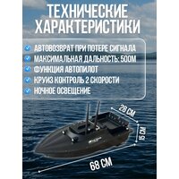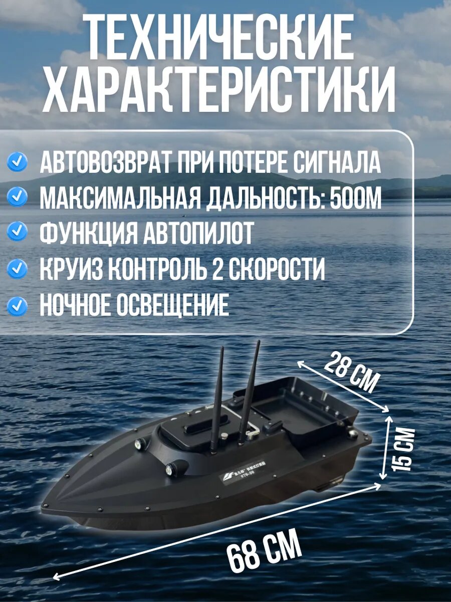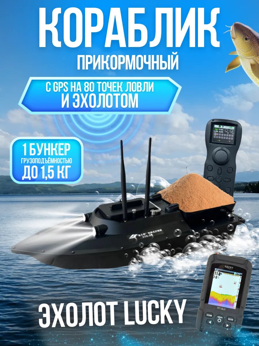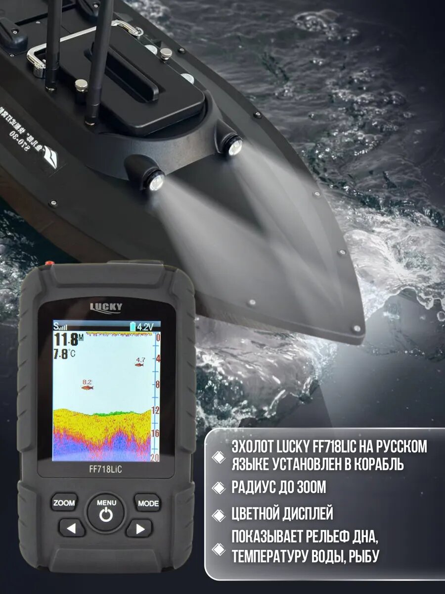 Кораблик прикормочный с GPS и эхолотом станет незаменимым помощником для любого рыболова. Модель оснащена GPS-модулем для точного позиционирования и эхолотом для определения глубины и рельефа дна. Дальность управления составляет 500 метров, что позволяет забрасывать прикормку на значительное расстояние. Корпус кораблика изготовлен из прочного ABS-пластика и металла, что гарантирует его долговечность. Вместительная кормовая секция вмещает до 2.5 кг прикормки, а емкий аккумулятор (30000 мА*ч) обеспечивает длительное время работы. Кораблик для рыбалки с одним бункером и GPS позиционированием используется для доставки приманки и прикормочных смесей к месту лова рыбы. В кораблик установлен эхолот Lucky. Кораблик запоминает 5 мест рыбалки по 16 точек ловли на каждом. Всего 80 точек ловли. Управление гнездовой лодкой происходит с помощью пульта. Дальность управления до 500м. В комплекте подробная инструкция на русском языке. У кораблика есть функция возврата домой при потери связи или низком уровне заряда. Общая длина корпуса прикормочного кораблика 68см. Увеличенная мощность двигателя, четырехлопастные винты, регулируемые корпусные фары для рыбалки в темное время (вкл/выкл), усиленный корпус, герметичный и водонепроницаемый, бесступенчатое регулирование скорости, круиз-контроль. Рекомендации: не использовать в местах с растительностью, тиной, избегать накрутки на винты шнуров, лесок и прочих материалов.