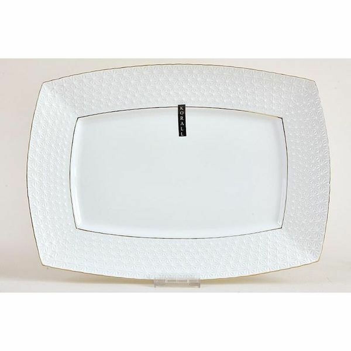 Блюдо "Снежная королева" непременно станет украшением вашего стола. Классическая расцветка в сочетании с современным дизайном придают блюду особый шик. Вместительный размер блюда прямоугольного идеально подходит не только для подачи основных блюд, таких как - салаты, рагу, дичь или рыба, но и для закусок - канапе, бутерброды, нарезка, фрукты и др. Блюдо прямоугольное изготовлено согласно современным технологиям производства керамической посуды премиум класса из керамики. Необычная прямоугольная форма Блюдо украшено рельефным бордюром в виде снежинок Отводка из 10% настоящего золота