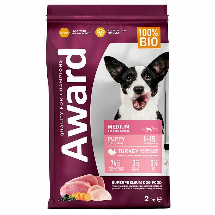 Купить Сухой корм AWARD для щенков от 1 месяца, беременных и кормящих сук всех пород с ягненком и индейкой с добавлением яблока и черники 2 кг с доставкой по всей России.