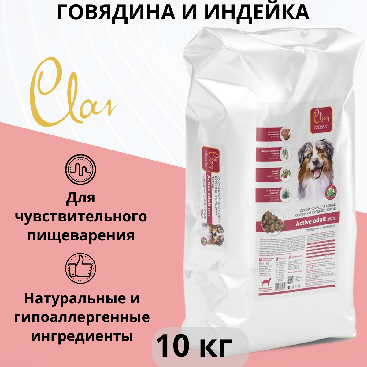 Купить Сухой корм CLAN CLASSIC ACTIVE 25/16 для активных взрослых собак крупных и средних пород с говядиной и индейкой (10 кг) с доставкой по всей России.