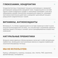 Хондропротекторы стимулируют процессы регенерации и замедляют дегенерацию (разрушение) хрящевой ткани. Содержащиеся в составе нашего корма хондроитин сульфат и глюкозамин принимают участие в образовании хрящей, биосинтезе синовиальной жидкости, оказывают противовоспалительное действие и замедляют дальнейший процесс разрушения соединительных тканей.